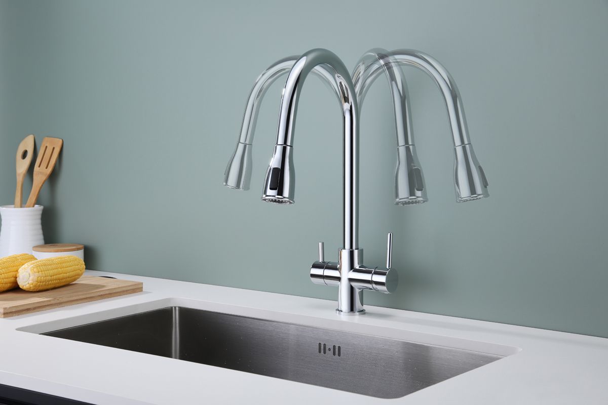 Смеситель под фильтрованную воду с выдвижным шлангом, артикул La214212-CRИзготовлен из высококачественной латуни, которая отвечает высочайшим европейским стандартам качества, не содержит свинца, не разрушается со временем и безопасна для здоровья.Вытяжной шланг