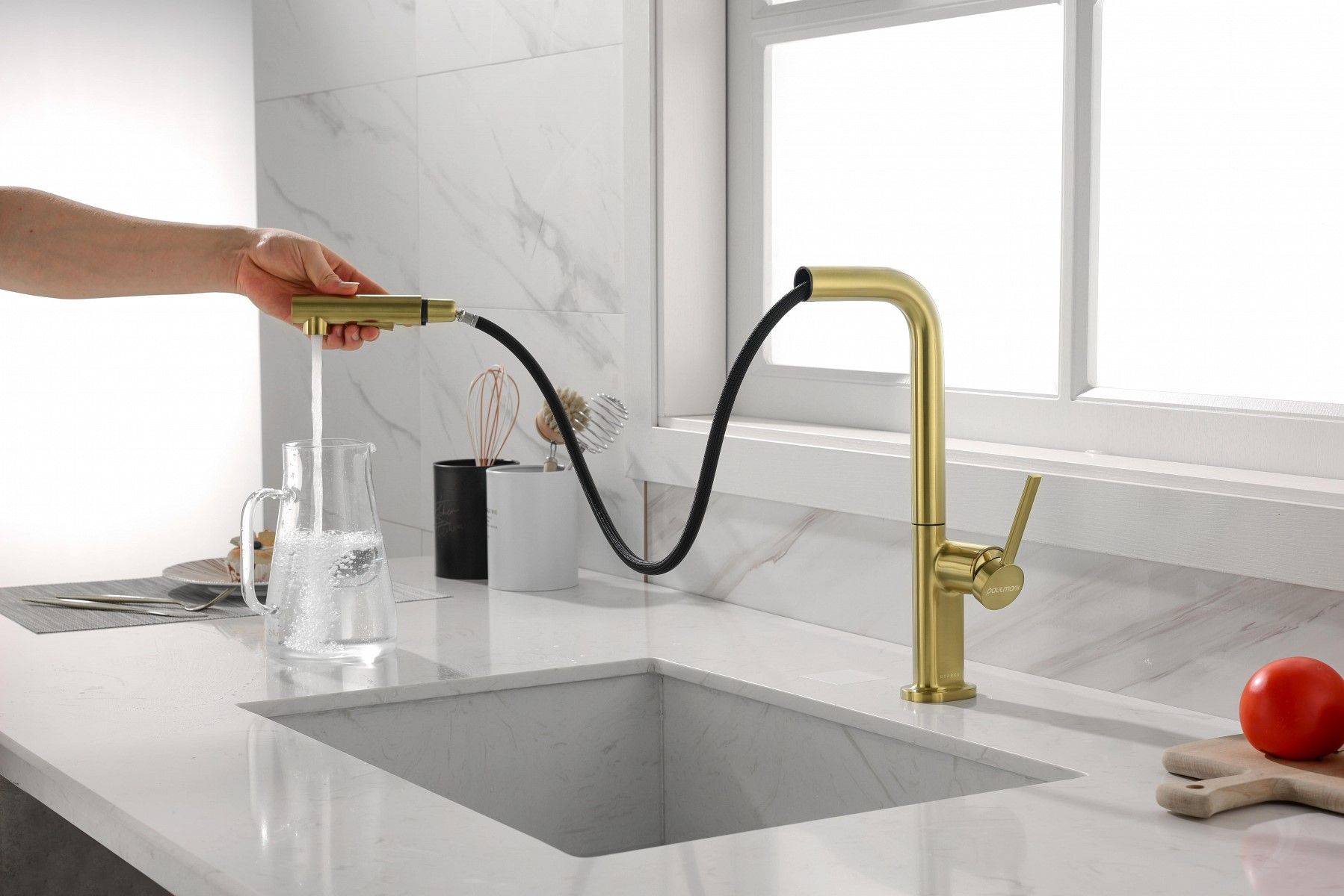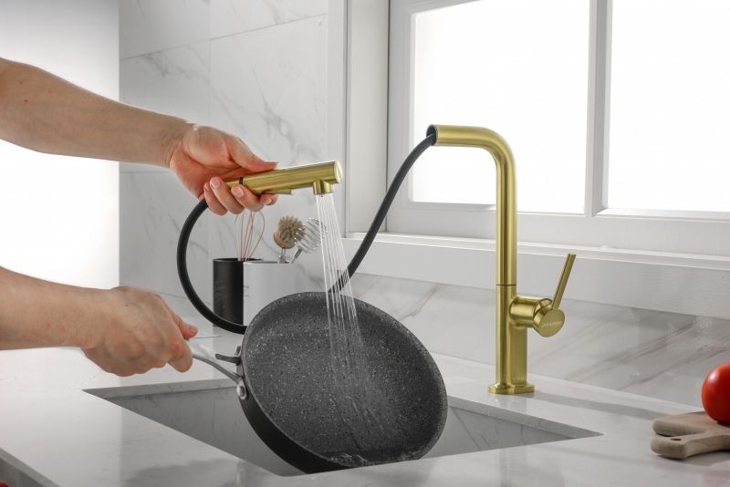Высокий Г-образный излив с функцией вращения на 360 градусов обеспечивает удобство использования. Выдвижная часть излива способна обеспечить максимально комфортную эксплуатацию и экономный расход воды.