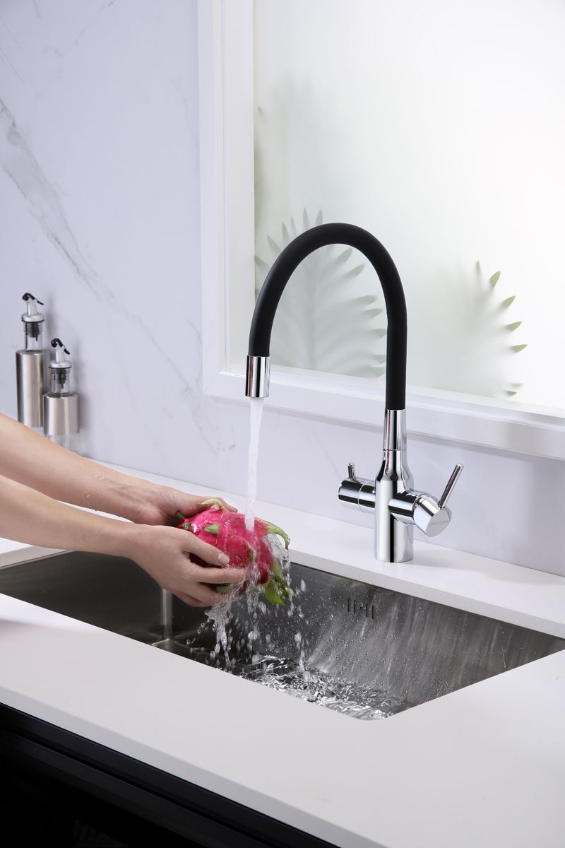 Смеситель под фильтр с гибким изливом, артикул Sa213419-CRСмеситель для кухни с возможностью подключения фильтра питьевой воды, эластичный излив с фиксацией.