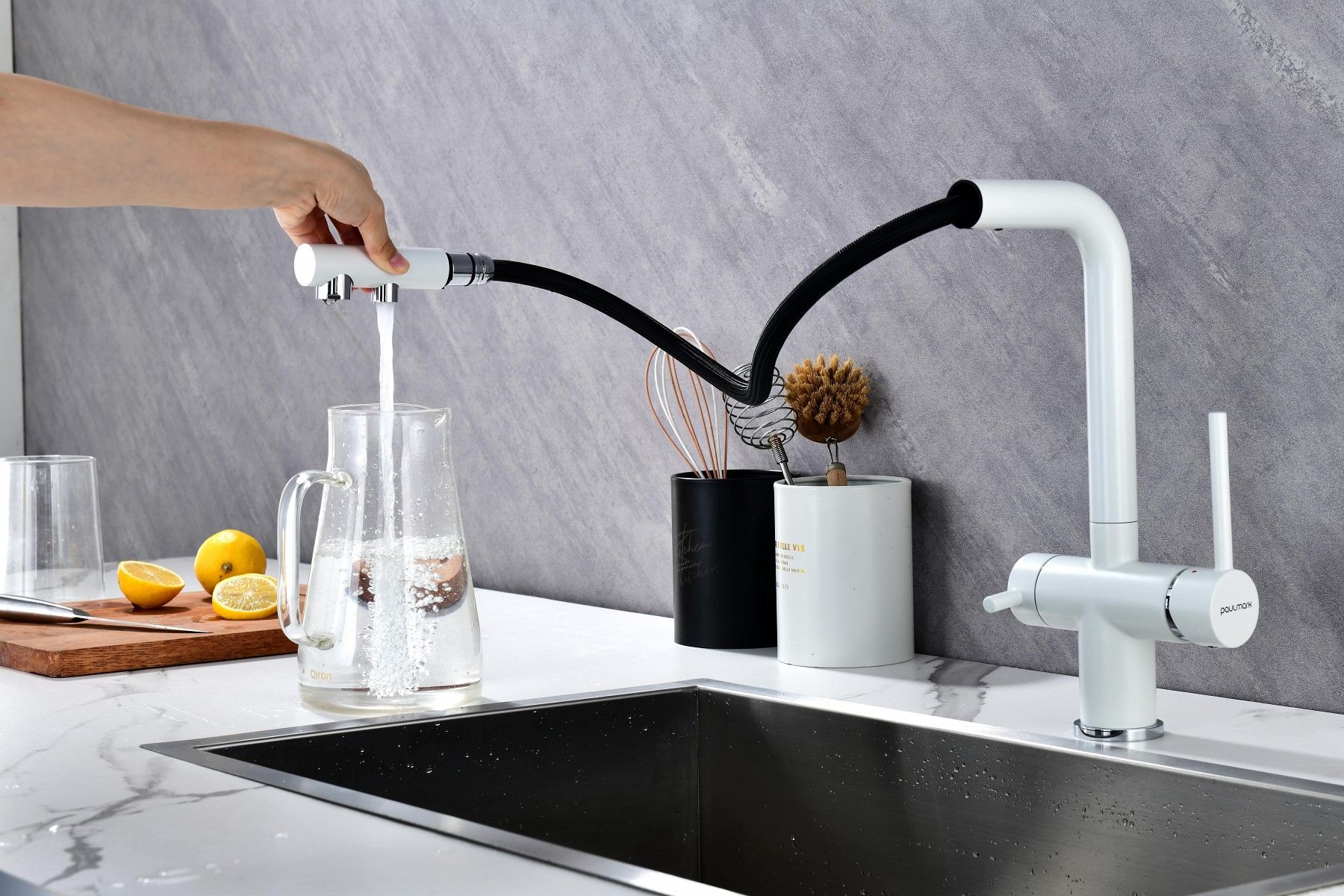 Смеситель для кухни с выдвижным изливом и возможностью подключения фильтра питьевой воды, артикул Se213222-431Изготовлен из высококачественной латуни, которая отвечает высочайшим европейским стандартам качества, не содержит свинца, не разрушается со временем и безопасна для здоровья.Смеситель для кухонной мойки SERPENTINE изготовлен из высококачественной латуни в классическом дизайне с изливом Г-образной формы. Излив поворотный на 180. Высота излива – 330 мм.