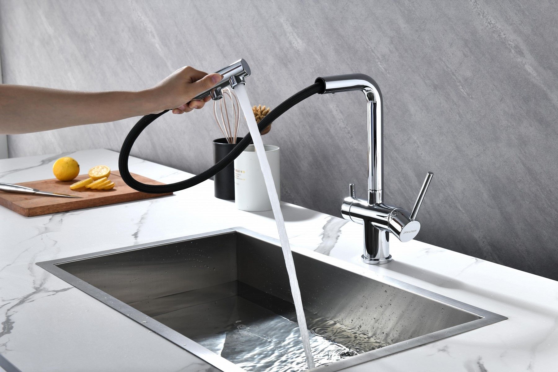 Смеситель для кухни с выдвижным изливом и возможностью подключения фильтра питьевой воды, артикул Se213222-CRИзготовлен из высококачественной латуни, которая отвечает высочайшим европейским стандартам качества, не содержит свинца, не разрушается со временем и безопасна для здоровья.Смеситель для кухонной мойки SERPENTINE изготовлен из высококачественной латуни в классическом дизайне с изливом Г-образной формы. Излив поворотный на 180. Высота излива – 330 мм.