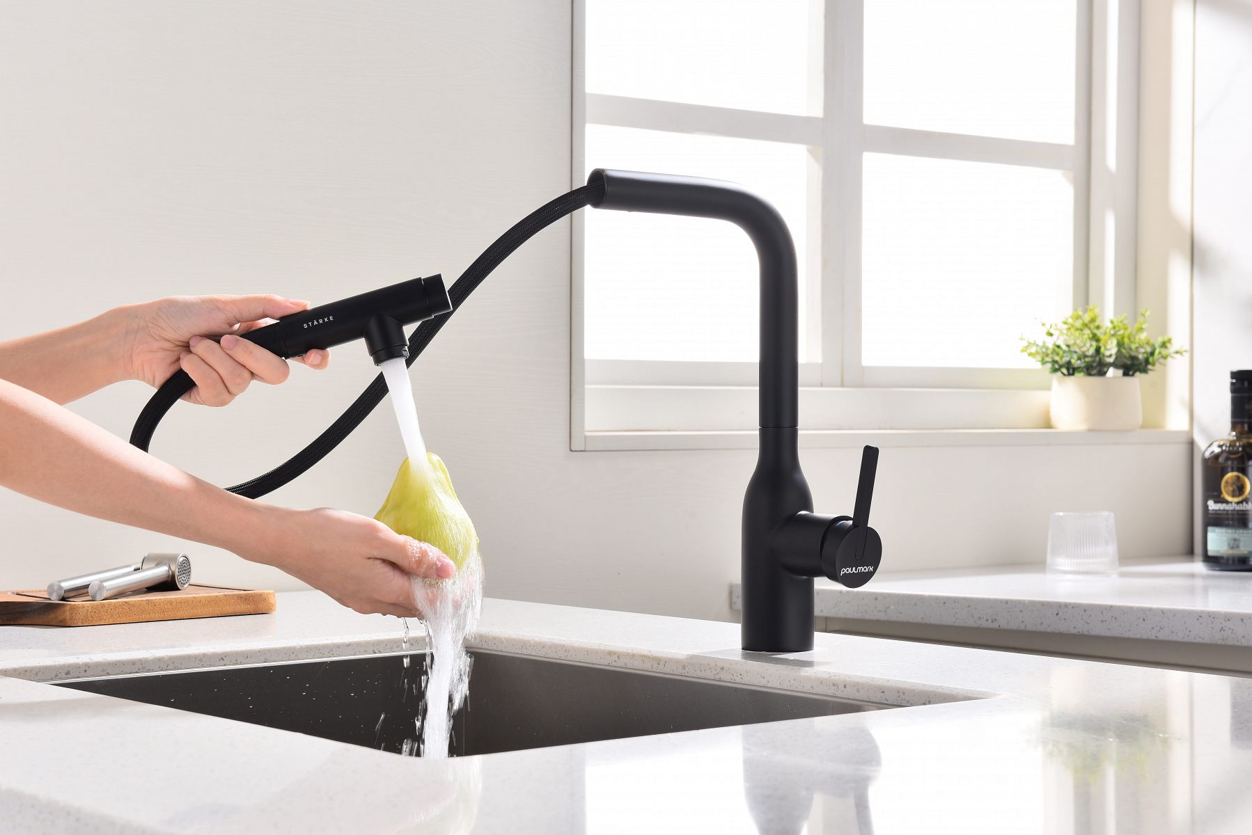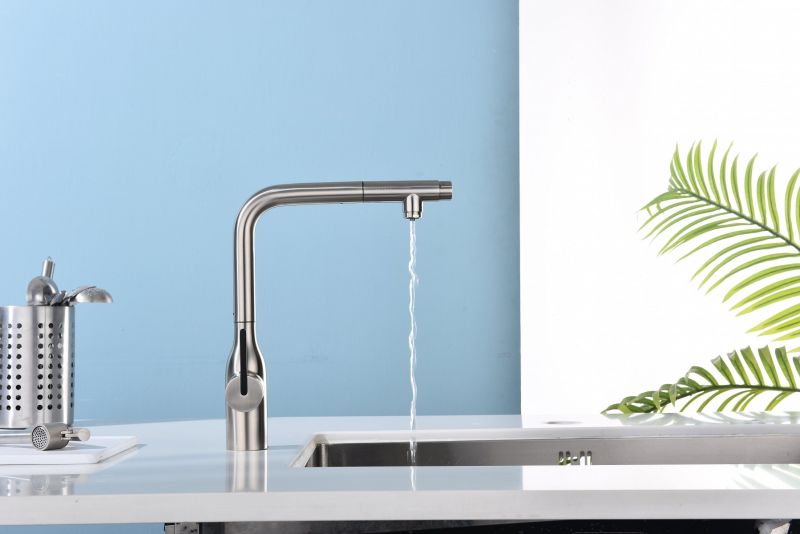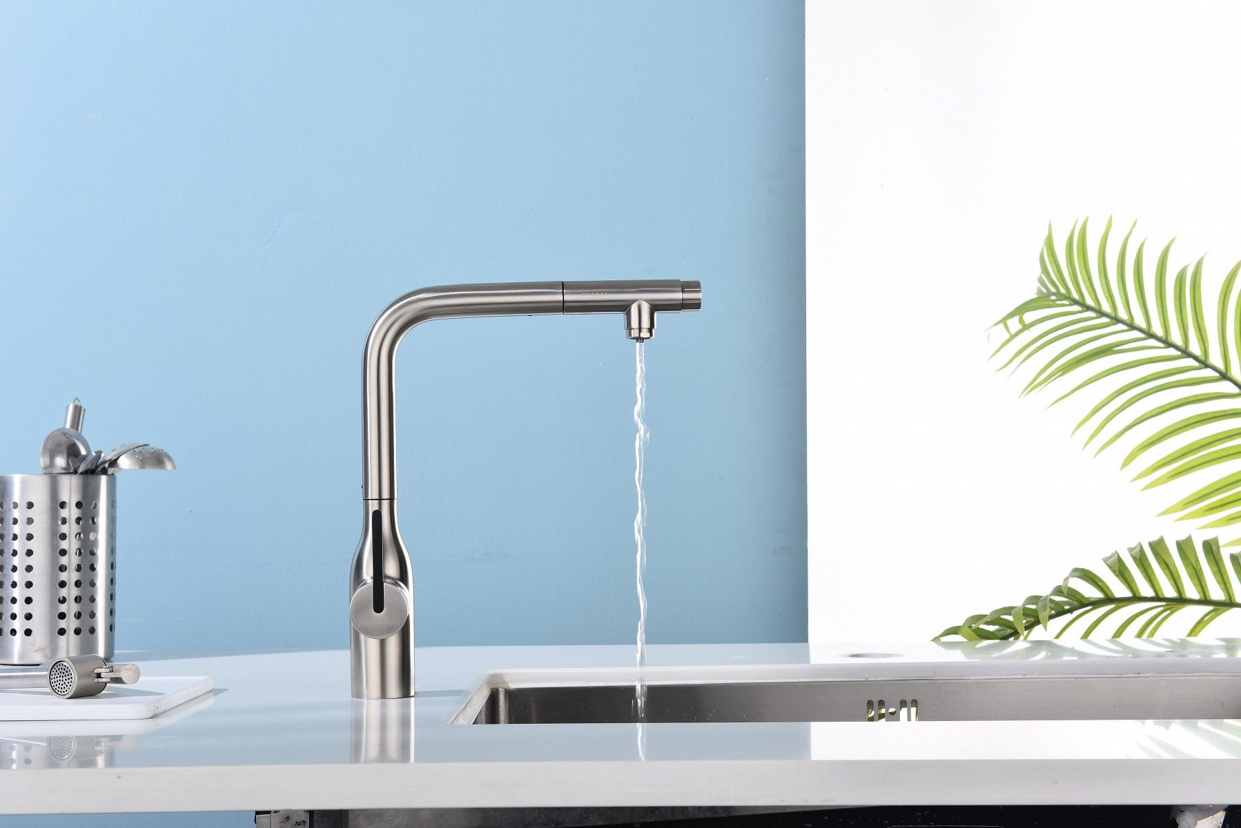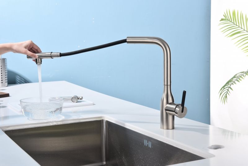 Высокий Г-образный излив с функцией вращения на 360 градусов обеспечивает удобство использования. Выдвижная часть излива способна обеспечить максимально комфортную эксплуатацию и экономный расход воды.