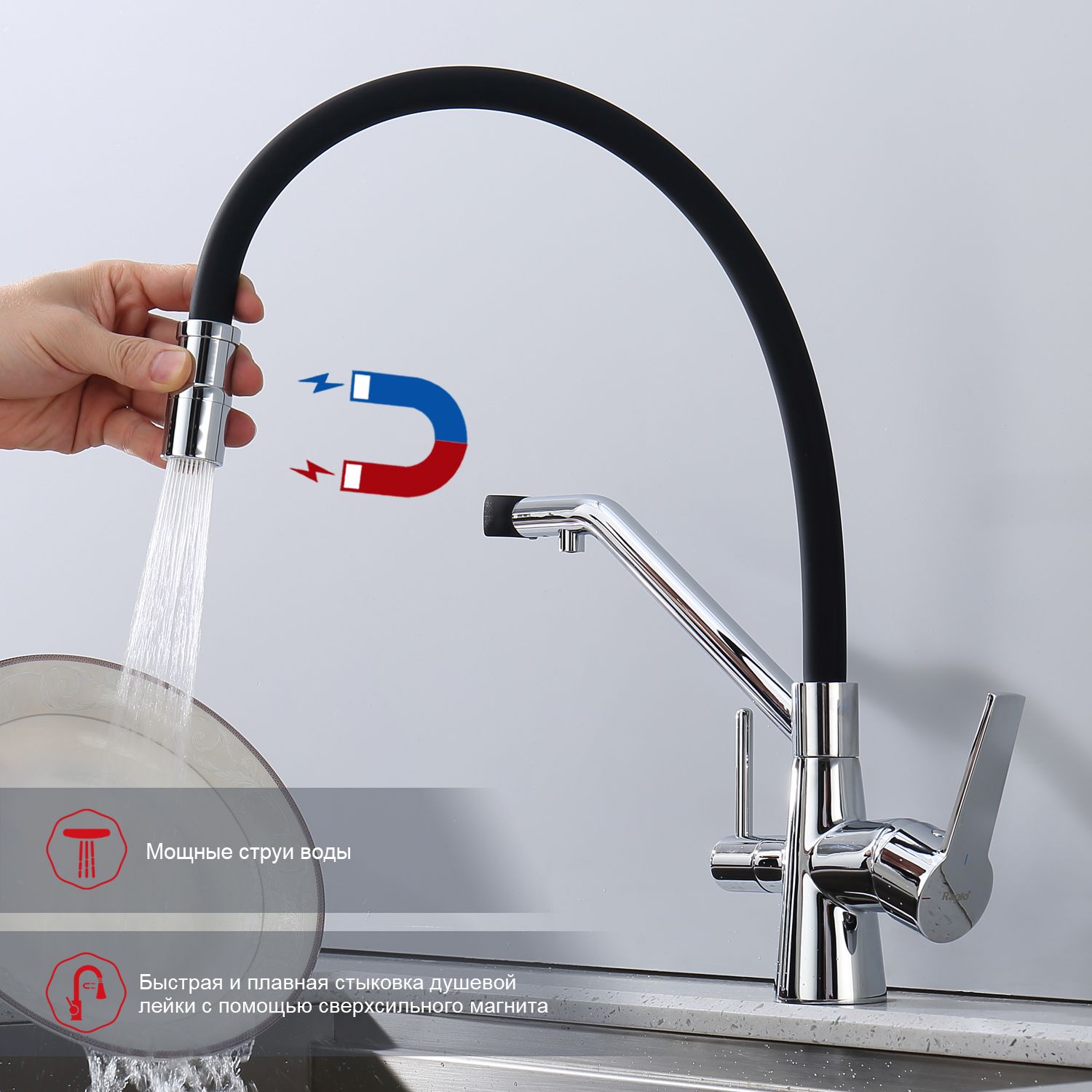 Смеситель для кухни со съемным изливом на магните и подключением фильтра питьевой воды. Гибкий съемный шланг значительно расширяет зону использования смесителя, благодаря этому можно мыть объемную посуду. Модель предназначена для одновременного подключения к водопроводу и фильтру и позволяет снабжать как обычной, так и питьевой водой.