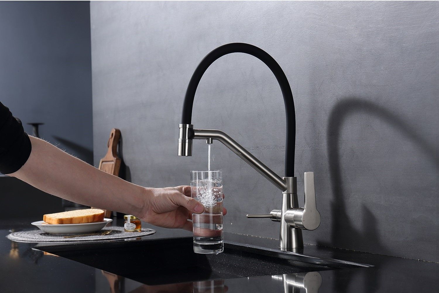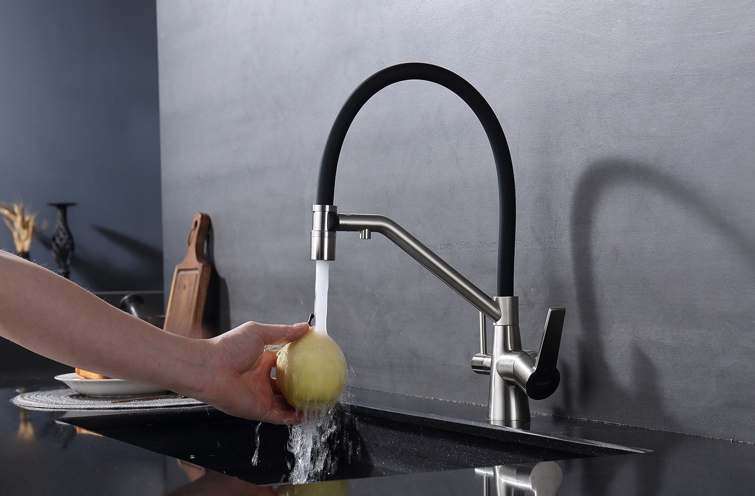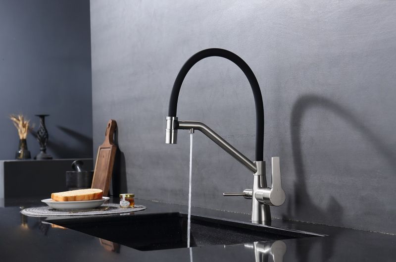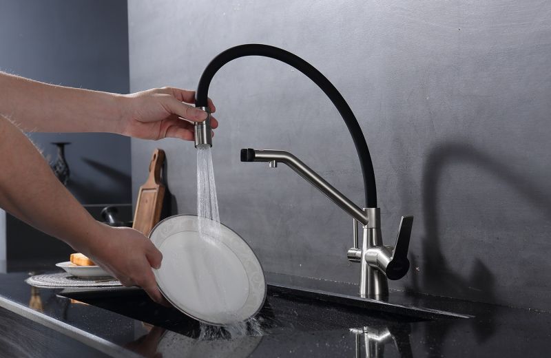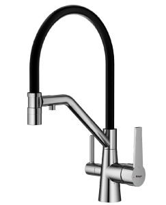 Смеситель для кухни со съемным изливом на магните и подключением фильтра питьевой воды. Гибкий съемный шланг значительно расширяет зону использования смесителя, благодаря этому можно мыть объемную посуду. Модель предназначена для одновременного подключения к водопроводу и фильтру и позволяет снабжать как обычной, так и питьевой водой.