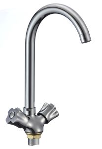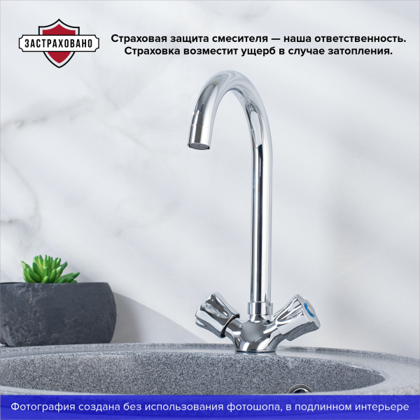 Привлекательный двуручковый смеситель для кухни с высоким поворотным изливом, обладает удобными в использовании ручками регулирования температуры и напора воды.
