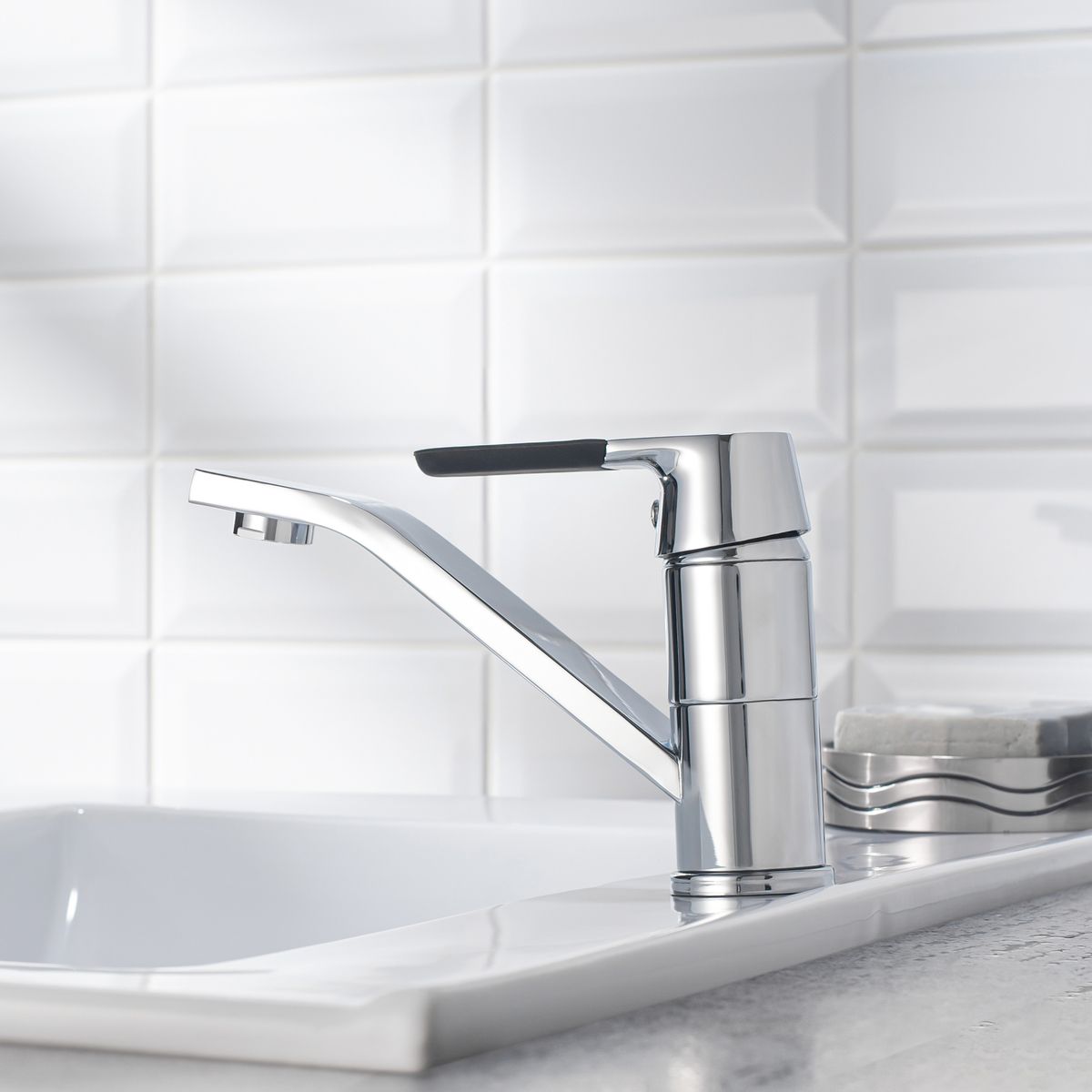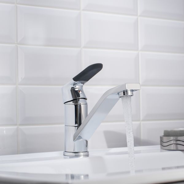 Надежный одноручковый смеситель для кухни с коротким поворотным изливом — это не только удобство в использовании, но и стильное сочетание хромового и черного покрытия.