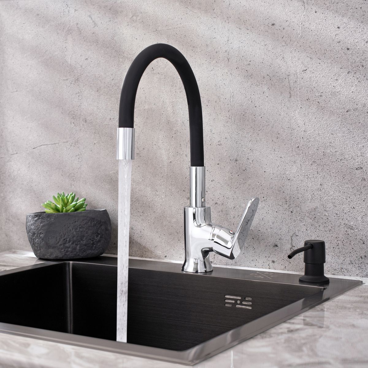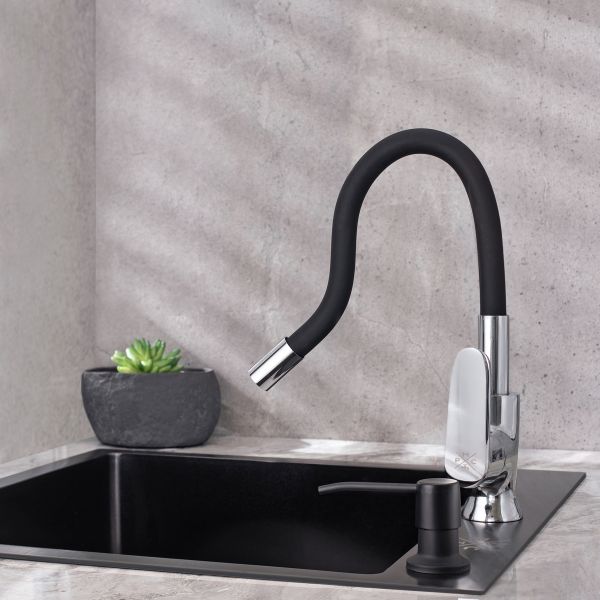 При производстве смесителей ТМ РМС используются только высококачественные материалы. Все модели проходят процесс гальванизации, что придает им большую износостойкость и улучшает антикоррозийные свойства. Установка смесителя крайне проста. Смесители РМС это сертифицированный продукт с 5-летней гарантией. Гибкая подводка идет в комплекте.Смеситель для кухни с высоким гибким изливом.Картирдж: керамический 35мм.Крепление: гайка.Аэратор: пластиковый.Покрытие: чёрный+хром.В комплекте: гибкая подводка