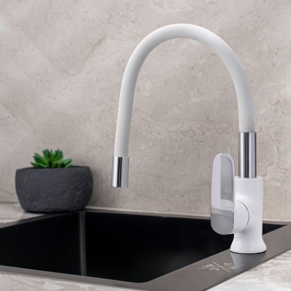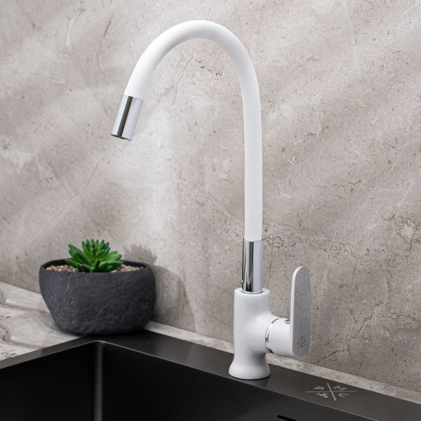 При производстве смесителей ТМ РМС используются только высококачественные материалы. Все модели проходят процесс гальванизации, что придает им большую износостойкость и улучшает антикоррозийные свойства. Установка смесителя крайне проста. Смесители РМС это сертифицированный продукт с 5-летней гарантией. Гибкая подводка идет в комплекте.Смеситель для кухни с высоким гибким изливом.Картирдж: керамический 35мм.Крепление: гайка.Аэратор: пластиковый.Покрытие: белый+хром.В комплекте: гибкая подводка