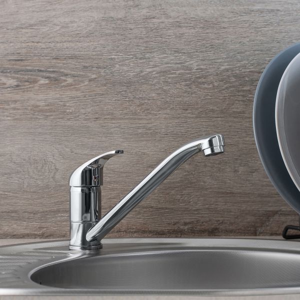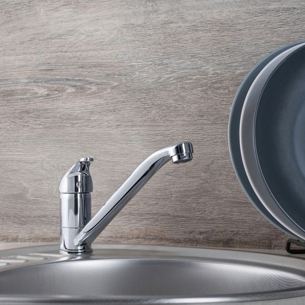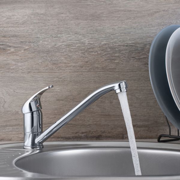 Классический однорычажный смеситель для кухни с длинным поворотным изливом обладает лаконичной ручкой регулировки температуры воды.