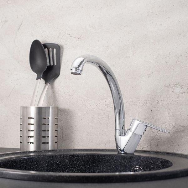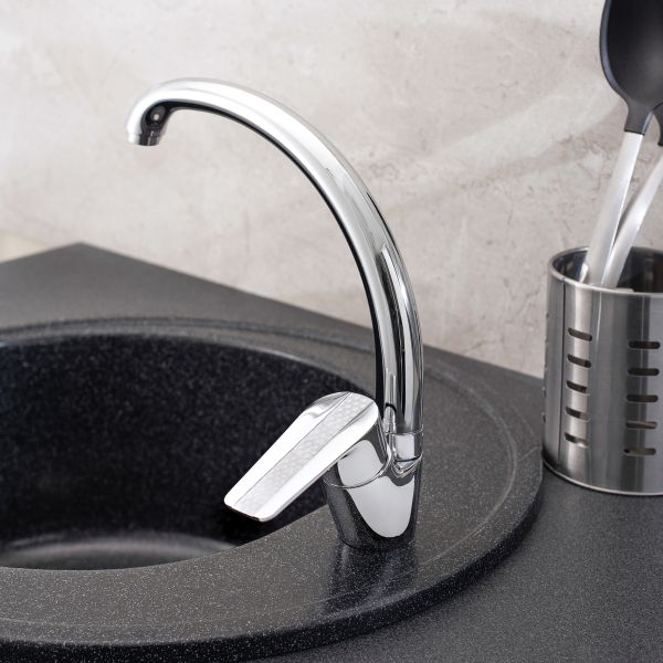 Классический однорычажный смеситель для кухни с высоким поворотным изливом, дополнен оригинальным оформлением ручки.