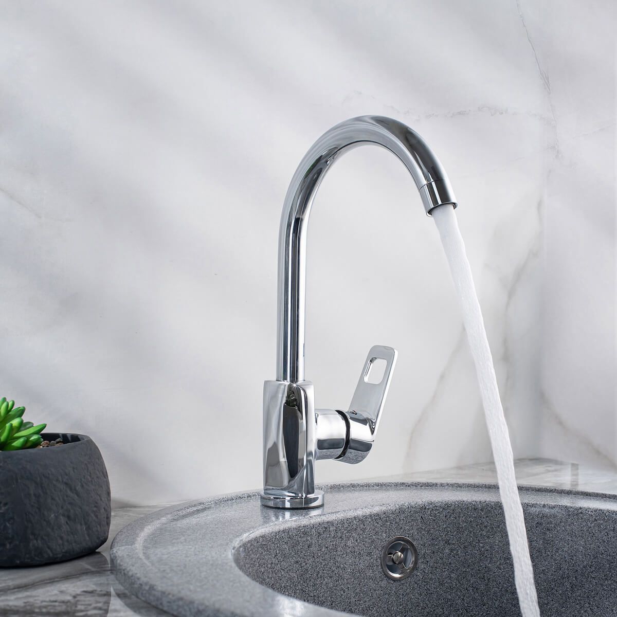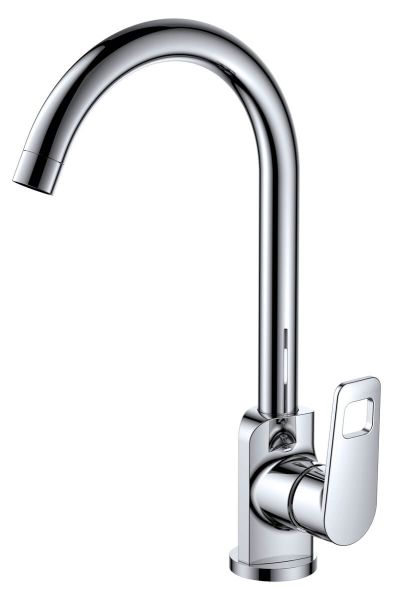 Функциональный однорычажный смеситель для кухни с высоким поворотным изливом станет неотъемлемой частью вашей кухни, а сочетание прямых линий и округлых форм стильно украсит кухонную мойку.