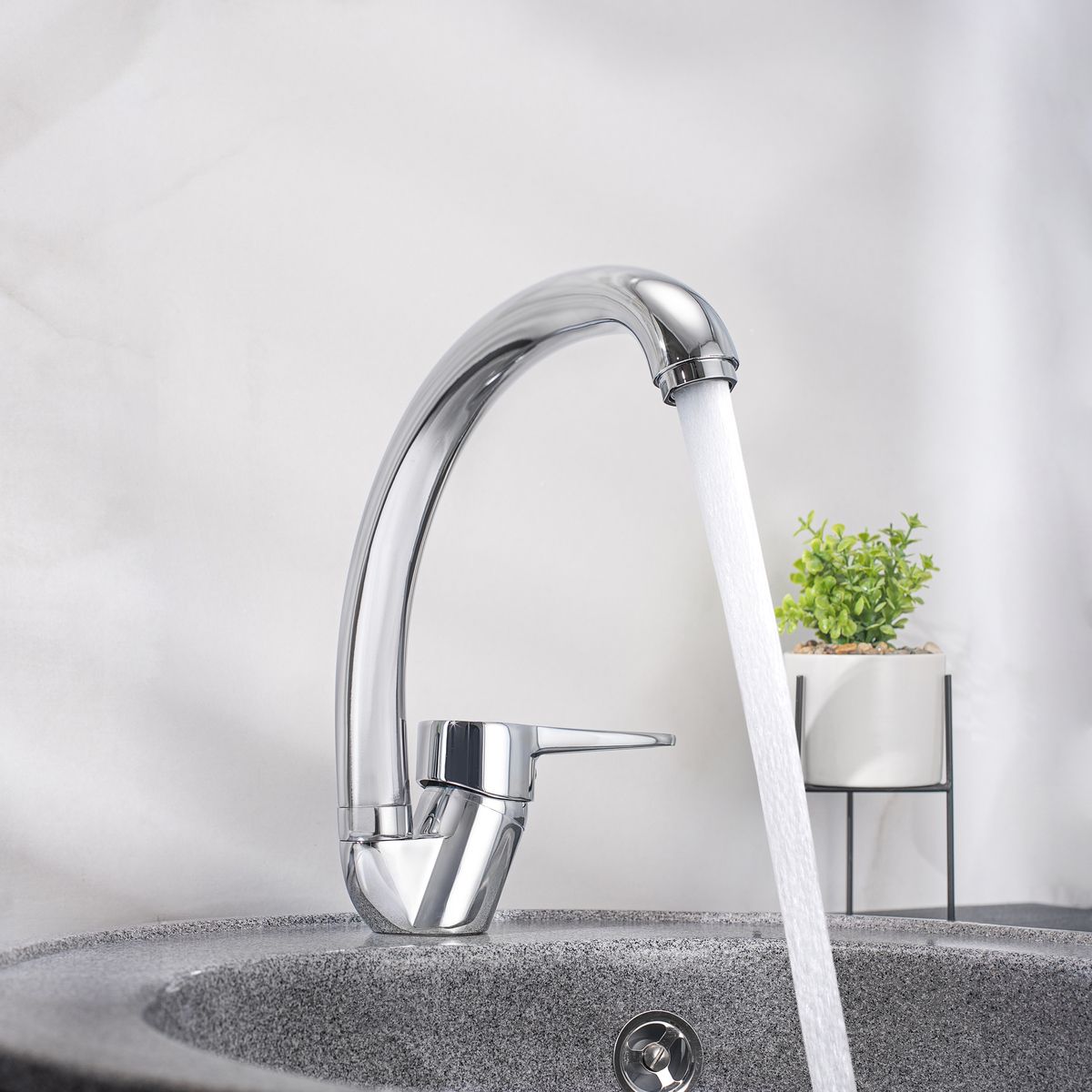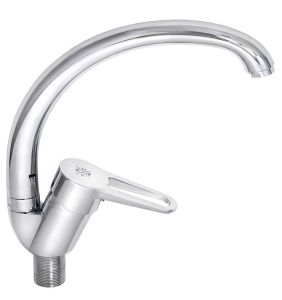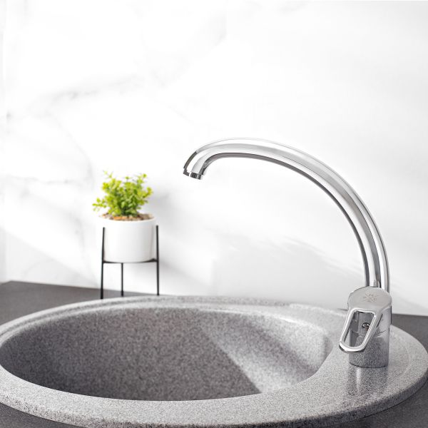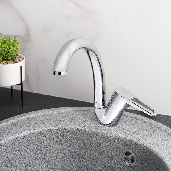 При производстве смесителей ТМ РМС используются только высококачественные материалы. Все модели проходят процесс гальванизации, что придает им большую износостойкость и улучшает антикоррозийные свойства. Установка смесителя крайне проста. Смесители РМС это сертифицированный продукт с 5-летней гарантией. Гибкая подводка идет в комплекте.Смеситель для кухни с высоким поворотным изливом.Картридж: керамический 35мм. Аэратор: пластиковый.Покрытие: хром.Крепление: гайка.В комплекте: гибкая подводка