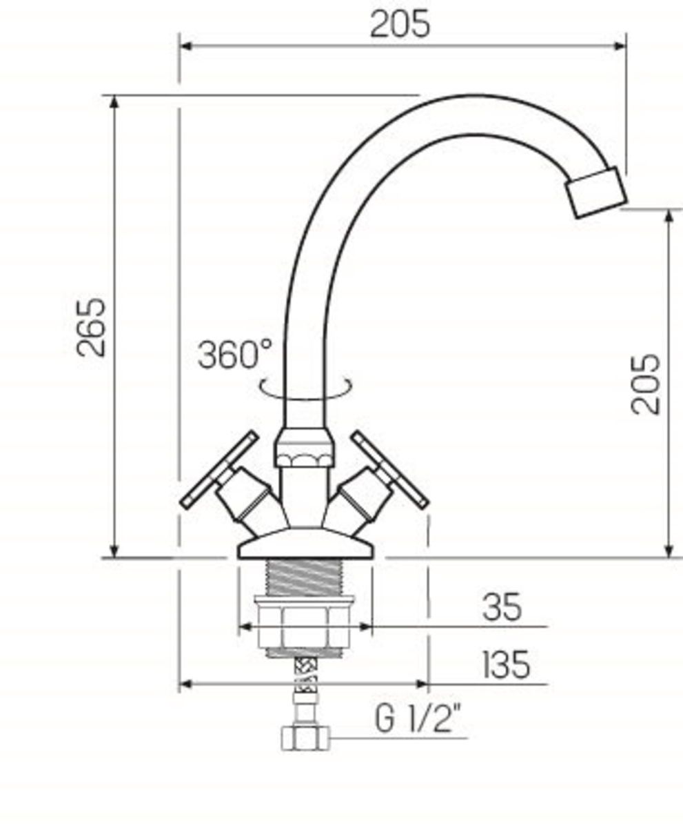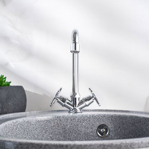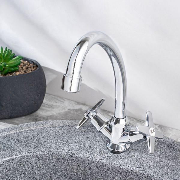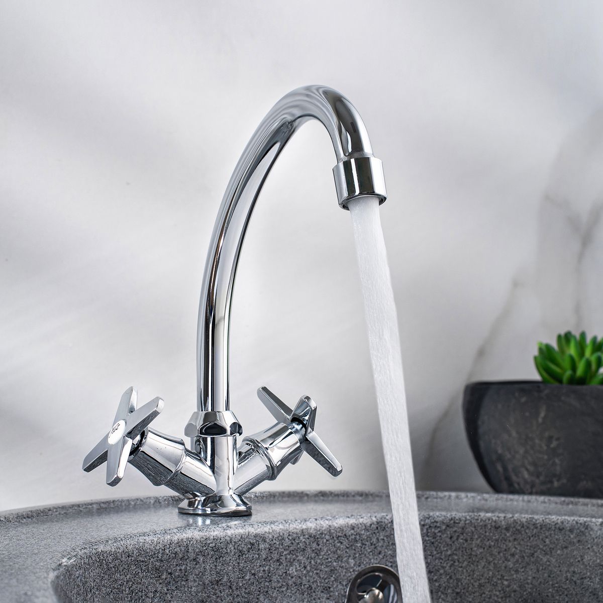 Стильный двуручковый смеситель для кухни с высоким поворотным изливом гармонично сочетает эффектный дизайн и эргономичность в использовании.