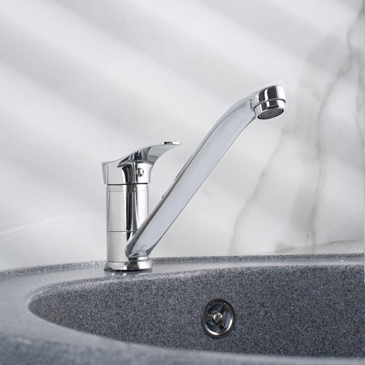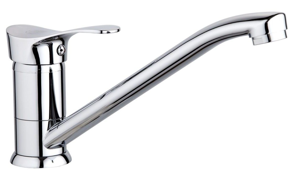 Однорычажный смеситель для кухни с длинным поворотным изливом обладает стильным минималистичным дизайном и гармонично подчеркнет интерьер вашей кухни.