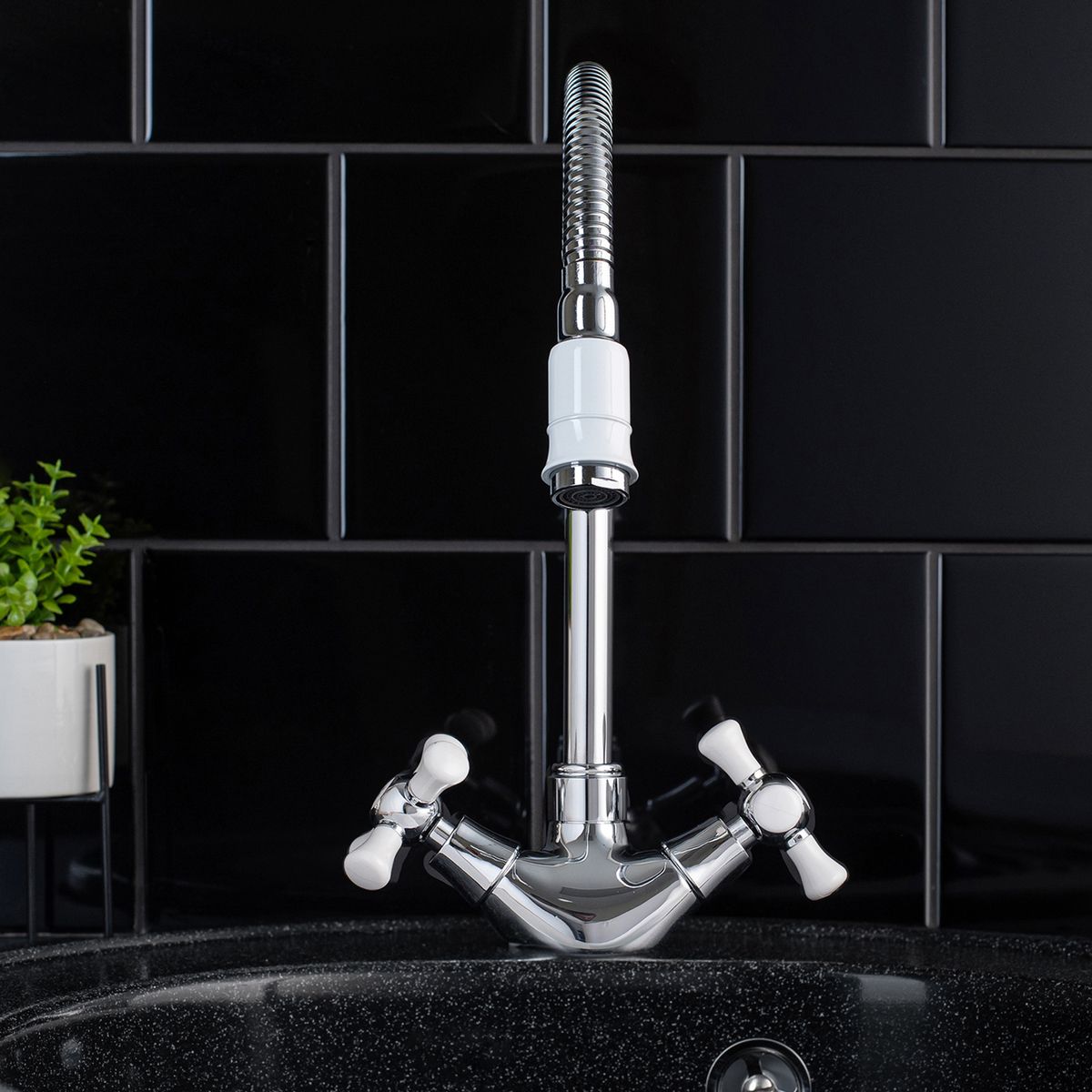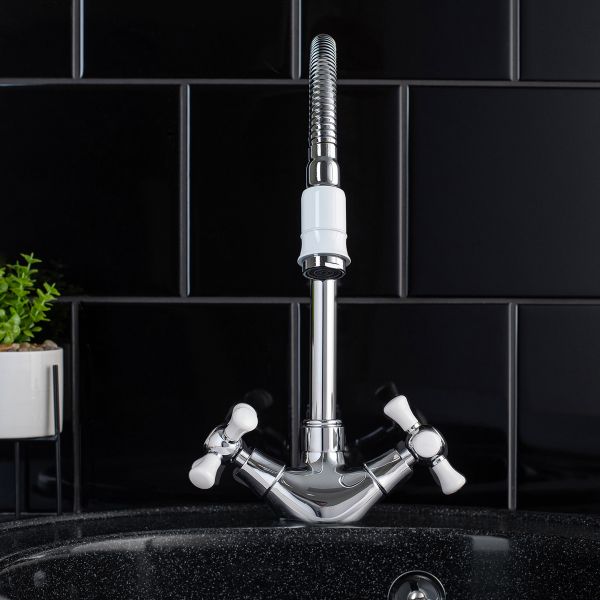Функциональный двуручковый смеситель для кухни с высоким гибким изливом порадует оригинальными цветовыми фрагментами оформления и станет стильным решением для вашего интерьера.