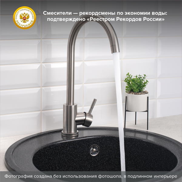Стильный одноручковый смеситель для кухни из нержавеющей стали с высоким изливом прекрасно подойдет для мойки любого размера.