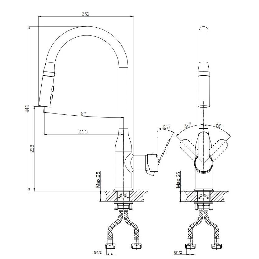 Смеситель для кухни RUSH арт. TE2835-24 с поворотным изливом и вытяжной лейкой с металлической ручкой из коллекции Tenerife изготовлен из высококачественной латуни и имеет рычажное управление, угол наклона- 8гр.В смеситель установлен картридж D-35 с керамическими пластинами. Высота смесителя 440 мм. Излив поворотный 211 мм. Высота излива до аэратора 226 мм. Аэратор изготовлен из пластика с нержавеющим корпусом.В комплекте универсальная присоединительная группа для установки на горизонтальную поверхность, гибкая подводка с латунными гайками 40 см - 2шт, фум-лента, индивидуальный пакет, паспорт, гарантийный талон.