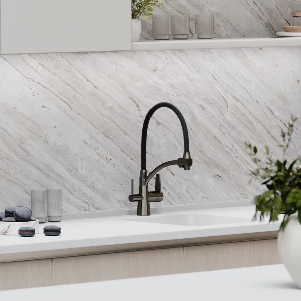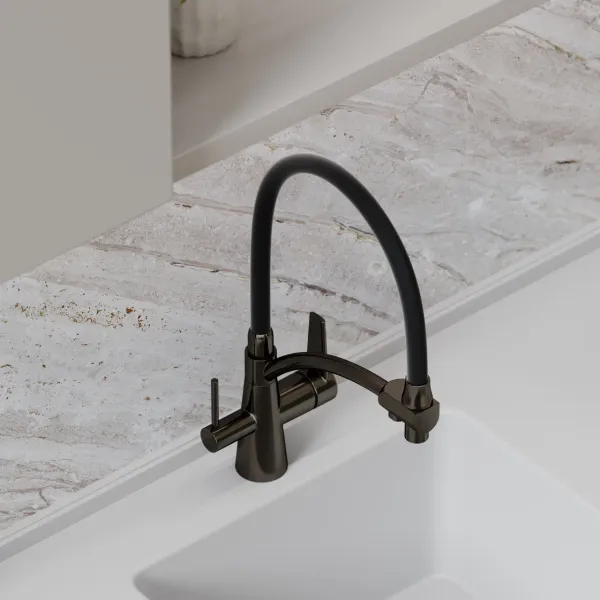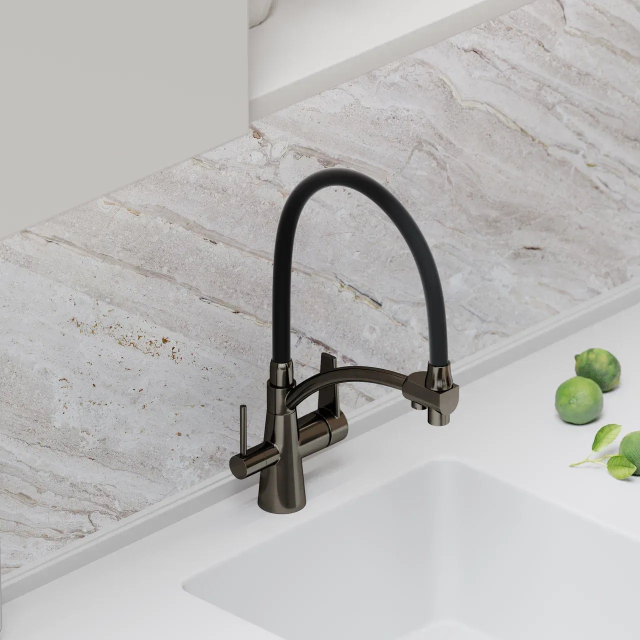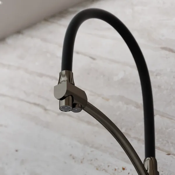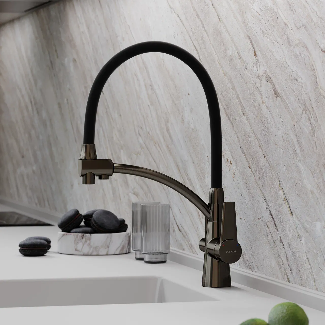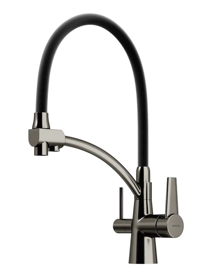 Смеситель для кухни SANCOS Eri с гибким изливом и возможностью подключения фильтра для воды, цвет вороненая сталь, арт. SC4001GGС возможностью регулировки температуры водыАэратор, гибкая подводка, ключ и крепления для монтажа, ключ для обслуживания аэратора