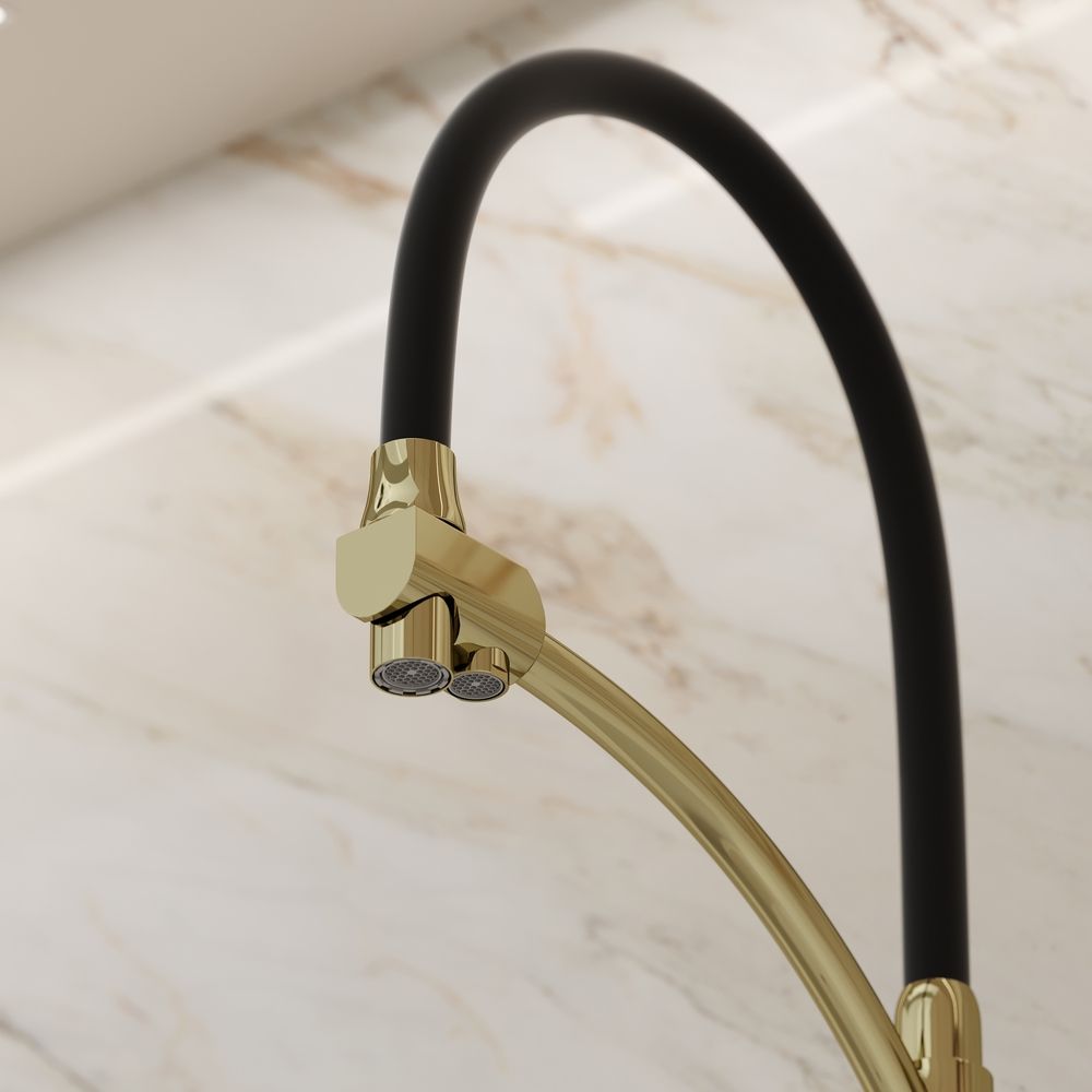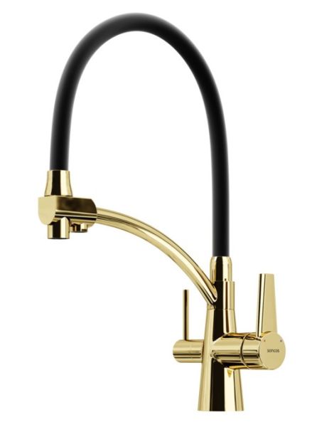 Смеситель для кухни SANCOS Eri с гибким изливом и возможностью подключения фильтра для воды, цвет полированное золото, арт. SC4001ZGС возможностью регулировки температуры водыАэратор, гибкая подводка, ключ и крепления для монтажа, ключ для обслуживания аэратора
