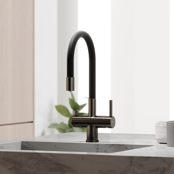 Смеситель для кухни SANCOS Lucia с гибким изливом и возможностью подключения фильтра для воды, цвет вороненая сталь, арт. SC4004GGС возможностью регулировки температуры водыАэратор, гибкая подводка, ключ и крепления для монтажа