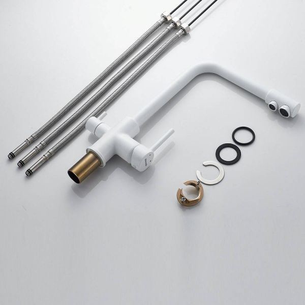 Во-первых, матовый белый цвет подойдет к любому дизайну кухни и будет гармонично смотреться в любом интерьере. Во-вторых, поворотный излив позволит легко настроить струю воды под любые ваши нужды, а встроенный канал для питьевой воды облегчит процесс фильтрации и подачи воды.