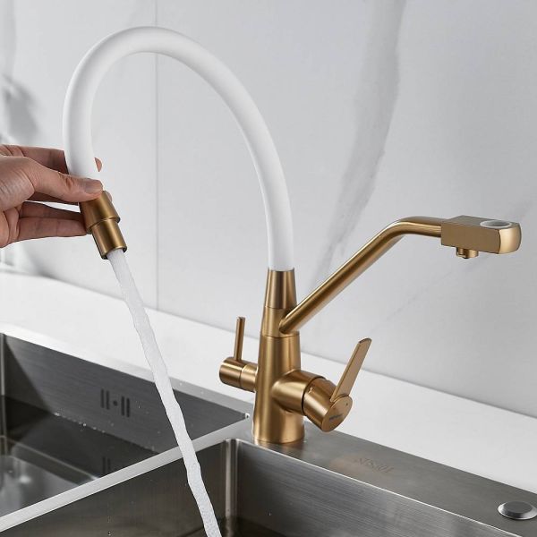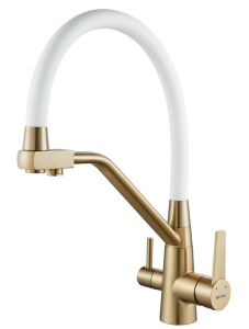 Смеситель для кухни с подключением фильтра и гибким изливом Shevanik S968G, золотой сатин.Управление: рычажное.