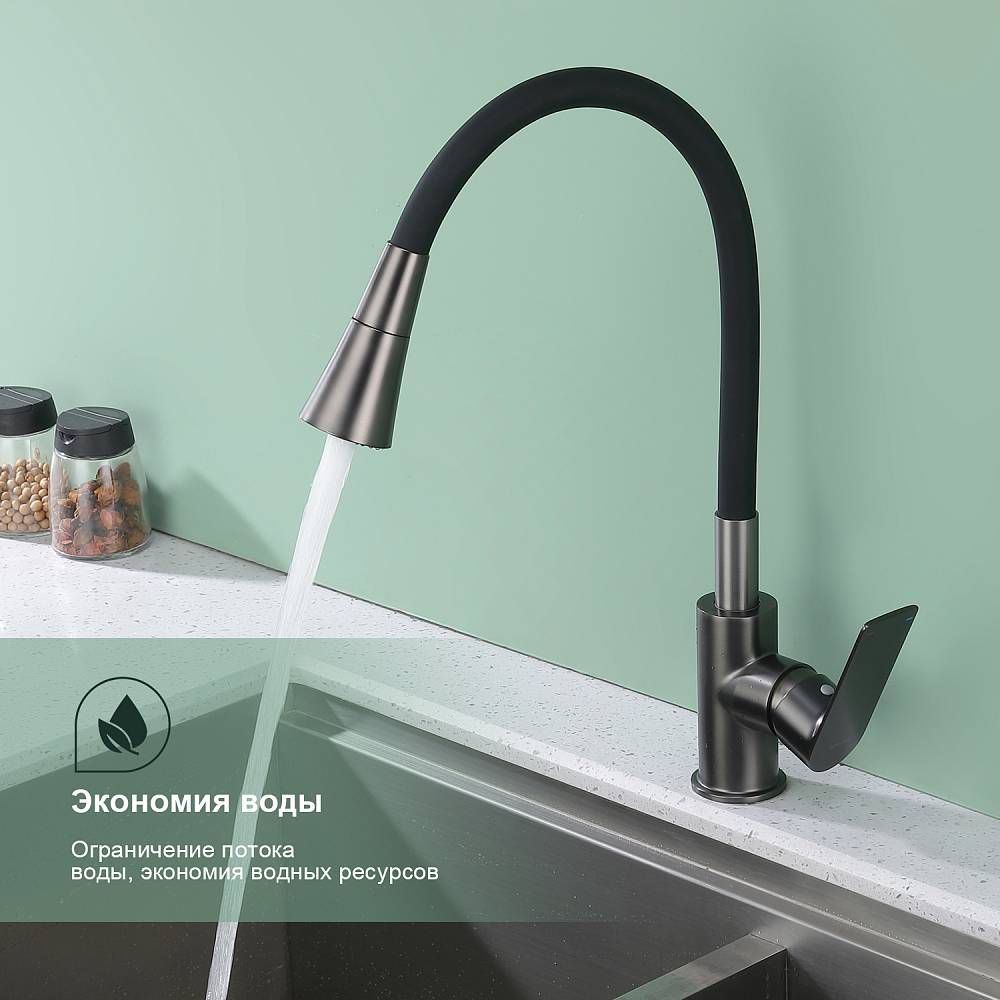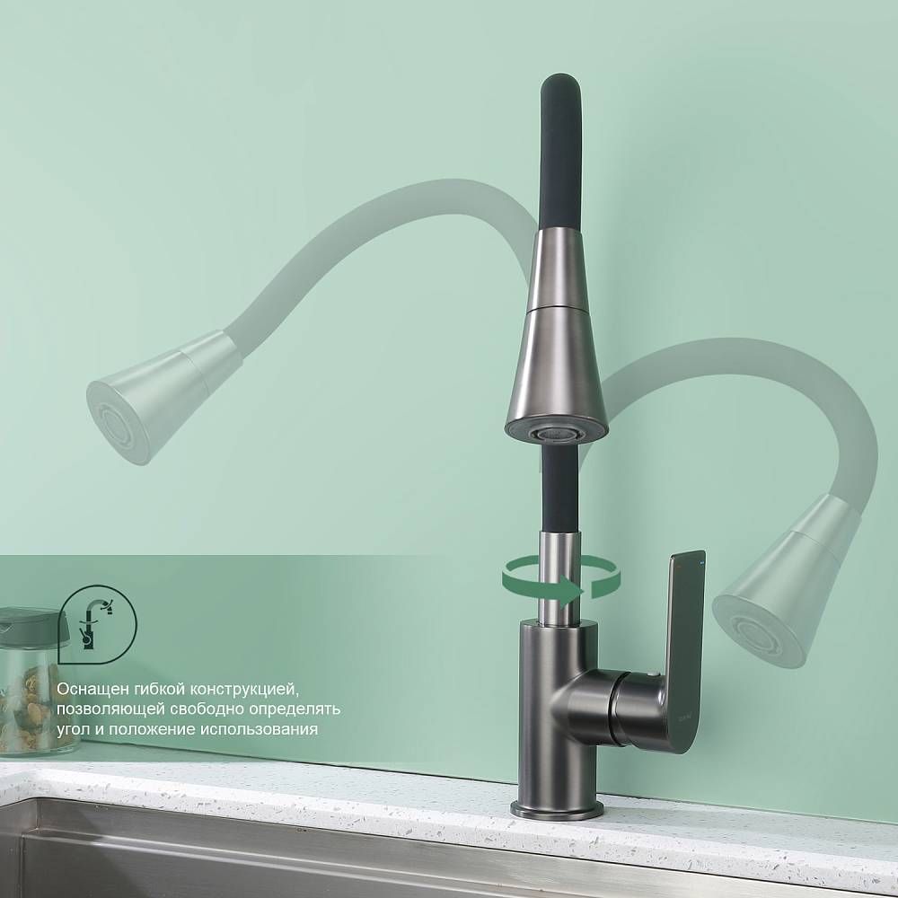 Смеситель для кухни Splenka S05.43.09 идеально подходит для кухонной мойки, раковины любого типа. Цвет: графит. Смеситель имеет 2 режима: поток воды и душ. Кран с гибким изливом имеет необычный внешний вид и особую конструкцию. С помощью гибкого шланга можно самостоятельно регулировать глубину выноса и высоту излива, что позволит избежать лишнего разбрызгивания воды. Также с помощью силиконового излива не составит труда добраться до всех мест в мойке, что упрощает мытье посуды и продуктов. Стильный латунный смеситель имеет свойство шумоподавления.