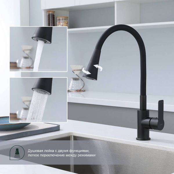 Смеситель для кухни Splenka S06.43.06 идеально подходит для кухонной мойки, раковины любого типа. Цвет: черный. Смеситель имеет 2 режима: поток воды и душ. Кран с гибким изливом имеет необычный внешний вид и особую конструкцию. С помощью гибкого шланга можно самостоятельно регулировать глубину выноса и высоту излива, что позволит избежать лишнего разбрызгивания воды. Также с помощью силиконового излива не составит труда добраться до всех мест в мойке, а также упрощает мытье посуды и продуктов. Стильный латунный смеситель имеет свойство шумоподавления.
