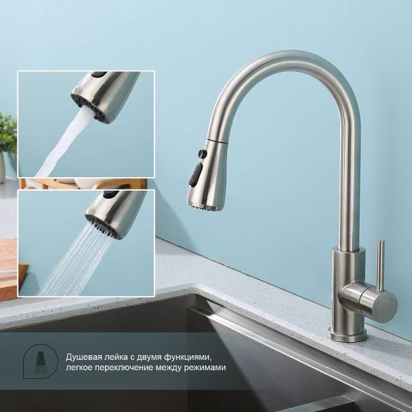 Смеситель для кухни с выдвижным изливом Splenka S203.49.05. Цвет: сатин. Смеситель для кухни с выдвижным изливом из нержавеющей стали. Излив смесителя оснащен аэратором, что обеспечивает экономичный расход воды. Излив поворотный и выдвижной. Механизм смесителя: керамический картридж. Управление рычажное. Подводка гибкая 1/2. Режимы лейки: 2. Данная модель отличается своей долговечностью и хорошим качеством.