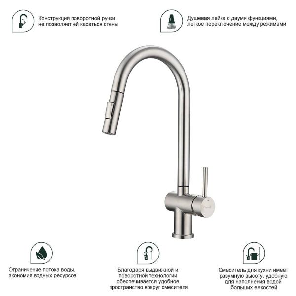 Смеситель для кухни с выдвижным изливом Splenka S204.49.05. Цвет: сатин. Смеситель для кухни с выдвижным изливом из нержавеющей стали. Излив смесителя оснащен аэратором, что обеспечивает экономичный расход воды. Излив поворотный и выдвижной. Механизм смесителя: керамический картридж. Управление рычажное. Подводка гибкая 1/2. Режимы лейки: 2. Данная модель отличается своей долговечностью и хорошим качеством.
