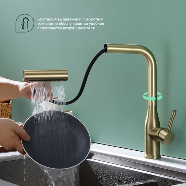 Смеситель оснащён выдвижным и поворотным изливом с режимом «душ», который позволяет выбирать между обычной струёй воды и мягкой душевой насадкой. Благодаря этому вы сможете легко и быстро настроить нужный режим в зависимости от ваших потребностей и предпочтений.