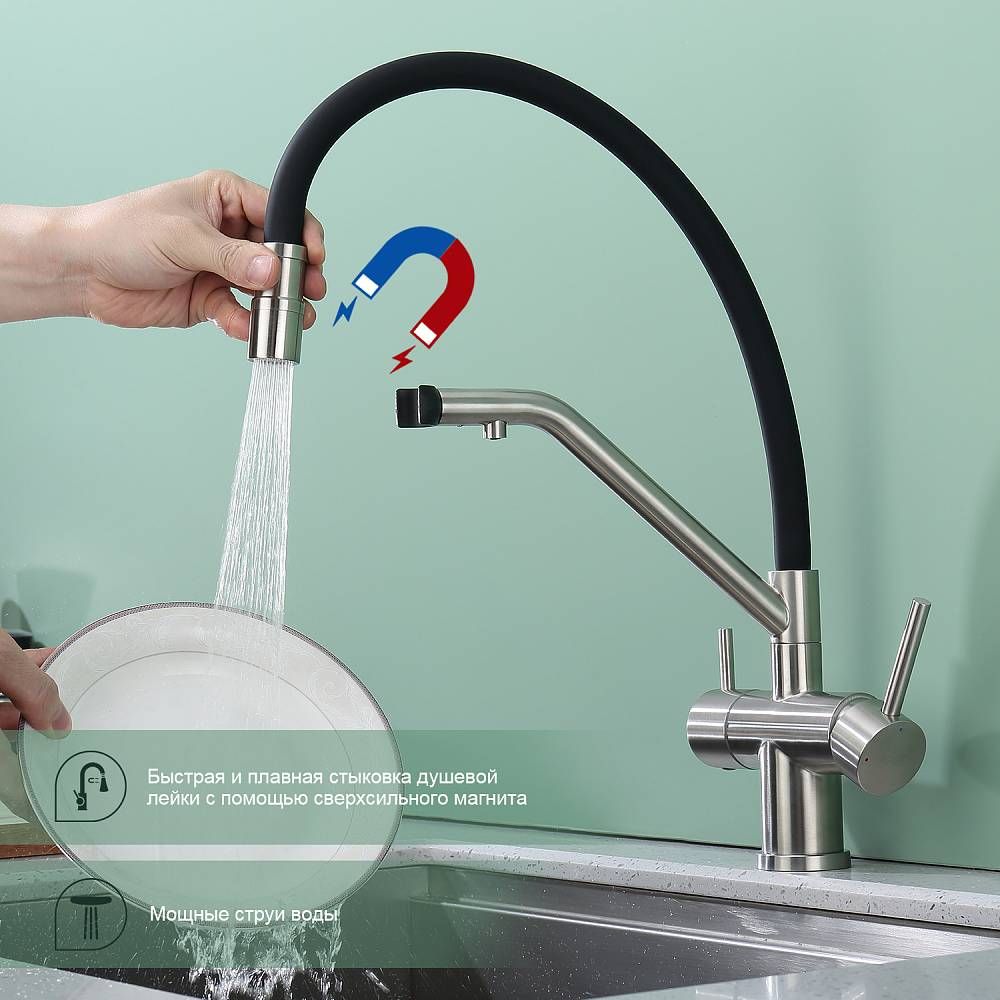 Splenka S70.62.05 Смеситель для кухни со съемным изливом на магните и подключением фильтра питьевой воды. Смесители для кухни с гибким изливом имеют необычный внешний вид и особую конструкцию. Нижняя часть представляет собой обычный однорукий латунный смеситель с регулировкой холодной и горячей воды, регулировкой напора и переключателем на фильтр с другой стороны. Верхняя часть это гибкий излив из пищевого силикона. С его помощью можно самостоятельно регулировать глубину выноса и высоту излива, что решает проблему при наполнении раковины посудой. Смеситель поворачивается на 360 градусов и оснащен отдельным выходом для фильтрованной воды. Переключение на воду из фильтра осуществляется переключателем с керамическим картриджем.
