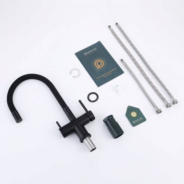Смеситель для кухни с подключением к фильтру питьевой воды Splenka S70.64.06. Цвет: черный. Гибкая подводка 50 см идет в комплекте. Благодаря грамотно разработанной конструкции, прибор отлично справляется с регулированием температуры и напора потоков воды. Однорычажные смесители максимально удобны при эксплуатации, всего одним движением руки можно закрыть или открыть воду, имеют стильный внешний вид, а также комфортность в использовании. Гарантия 5 лет.