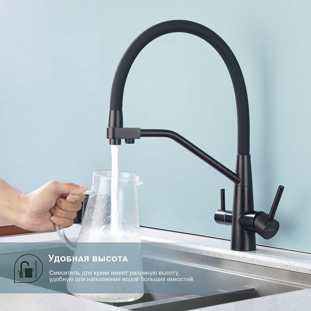 Смеситель для кухни с подключением к фильтру питьевой воды Splenka S71.62.06. Цвет: черный. Гибкая подводка 50 см идет в комплекте. Благодаря грамотно разработанной конструкции, прибор отлично справляется с регулированием температуры и напора потоков воды. Однорычажные смесители максимально удобны при эксплуатации, всего одним движением руки можно закрыть или открыть воду, имеют стильный внешний вид, а также комфортность в использовании. Гарантия 5 лет.