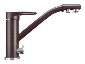 Высокоэргономичный кухонный смеситель с дополнительным краном для подключения фильтрованной воды, оснащенный кран-буксой с керамическими пластинами. Реализован тройной подвод воды через один излив: холодная, горячая и фильтрованная. Переход с одного подвода на другой производится поворотом рычага. Набор для соединения с фильтром входит в комплект. Система фильтрации приобретается дополнительно и монтируется под мойку, специальный индикатор сообщает о необходимости замены картриджа. Материал корпуса выполнен из высококачественной латуни, а окрашивание под искусственный камень в цвет мойки ULGRAN выполняется на собственном производстве, что позволяет идеально попасть в фирменный цвет ULGRAN. В качестве керамического картриджа используется известный бренд Wanhai диаметром 35 мм с высокой пропускной способностью в 500 тысяч циклов открывания-закрывания. На подвижные части картриджа Wanhai нанесена специальная невымываемая силиконовая смазка, а керамические пластины изготовлены из 96 процентов оксида алюминия, что, в сочетании с высоким качеством шлифовки обеспечивает долговечность, надежность, плавность хода рукоятки. Смеситель оборудован съемным пластиковым аэратором для экономии воды и поворотным изливом на 360 градусов. В комплектацию входят: керамический картридж Wanhai, гибкая подводка, комплект крепежных элементов, кран-букса с керамическими пластинами для дополнительного излива для фильтрованной воды, набор для подсоединения фильтра питьевой воды (гибкая подводка + переходник-цанга), технический паспорт и гарантийный талон.Заводская