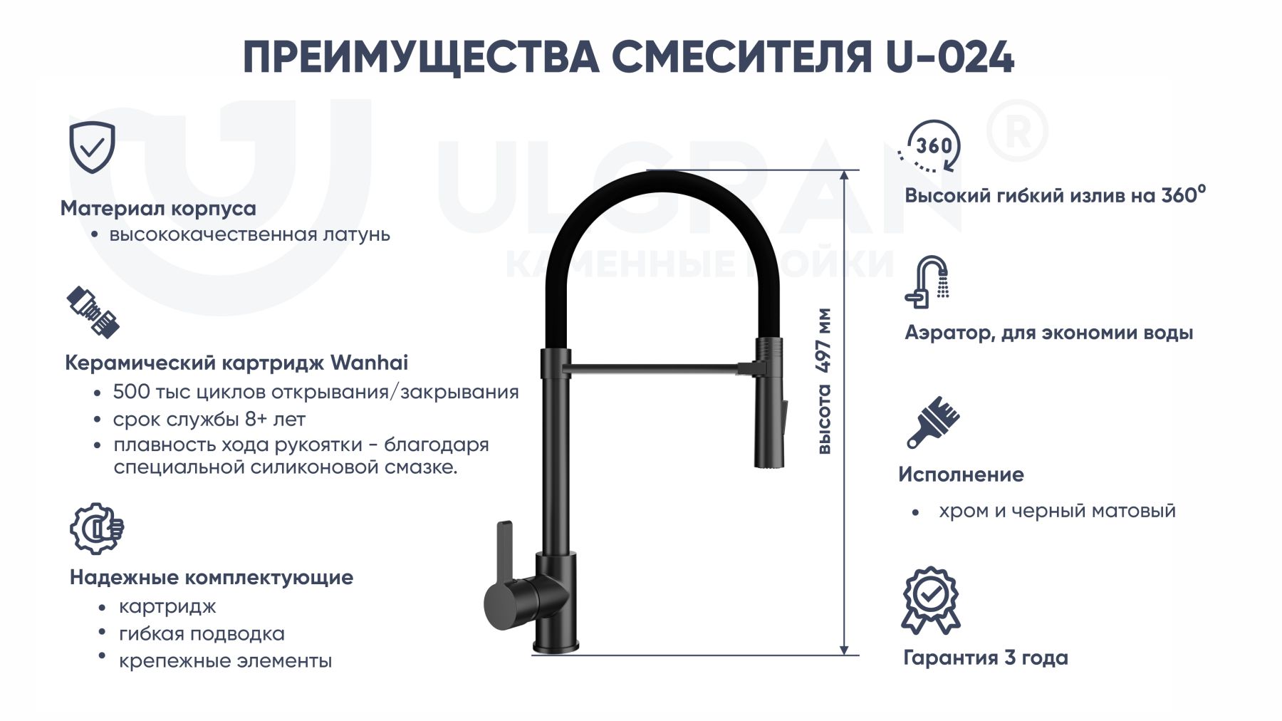 - Надежность – срок службы смесителей ULGRAN более 10 лет