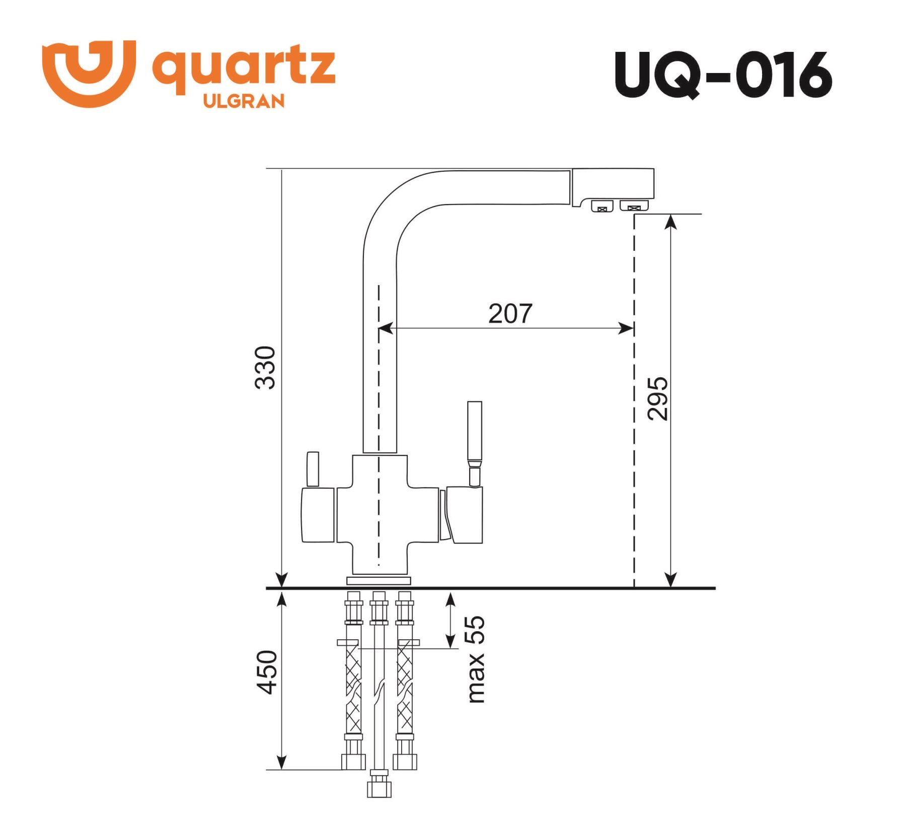 ULGRAN Quartz UQ-016 - высокоэргономичный кухонный смеситель с дополнительным краном для подключения фильтрованной воды, оснащенный кран-буксой с керамическими пластинами. Реализован тройной подвод воды через один излив: холодная, горячая и фильтрованная. Переход с одного подвода на другой производится поворотом рычага. Набор для соединения с фильтром входит в комплект . Система фильтрации приобретается дополнительно и монтируется под мойку, специальный индикатор сообщает о необходимости замены картриджа. Материал корпуса выполнен из высококачественной латуни, а окрашивание под "искусственный камень" в цвет мойки ULGRAN Quart выполняется на собственном производстве, что позволяет идеально попасть в фирменный цвет ULGRAN Quart. В качестве керамического картриджа используется известный бренд Wanhai диаметром 35 мм с высокой пропускной способностью в 500 тысяч циклов "открывания-закрывания". На подвижные части картриджа Wanhai нанесена специальная невымываемая силиконовая смазка, а керамические пластины изготовлены из 96% оксида алюминия, что, в сочетании с высоким качеством шлифовки обеспечивает долговечность, надежность, плавность хода рукоятки. Смеситель оборудован съемным пластиковым аэратором для экономии воды и поворотным изливом на 360 градусов. В комплектацию входят: керамический картридж Wanhai, гибкая подводка, комплект крепежных элементов, кран-букса с керамическими пластинами для дополнительного излива для фильтрованной воды, набор для подсоединения фильтра питьевой воды (гибкая подводка + переходник-цанга), технический паспорт и гарантийный талон. Заводская гарантия составляет 3 года на материал корпуса, 1 год на комплектующие к смесителю и 1 год на материал покрытия.МОЖНО