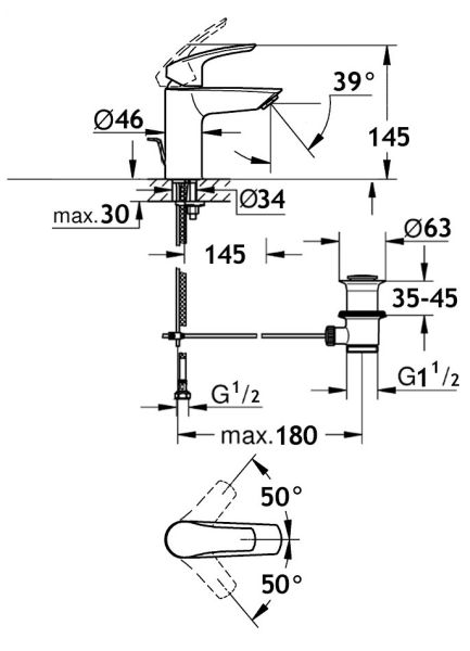 литой рычагмонтаж на одно отверстиеаэратор M 24 x 1керамический картридж с ограничителем горячей водыгибкая подводка G 1/2система быстрого монтажарычажный донный клапан 1 1/4Италия10 лет гарантии