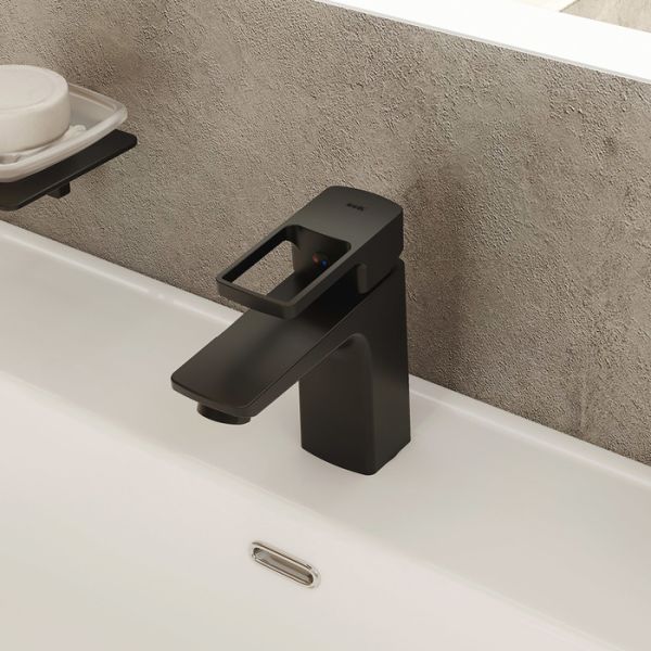 Смеситель для умывальника из коллекции Bild в актуальном черном матовом цвете отличается четкими геометрическими формами и уникальным дизайном ручки-петли с тонкой изящной рамкой — ее толщина составляет всего 2 мм. Благодаря улучшенной эргономике ручка смесителя удобно ложится в руку, делая управление невероятно комфортным.