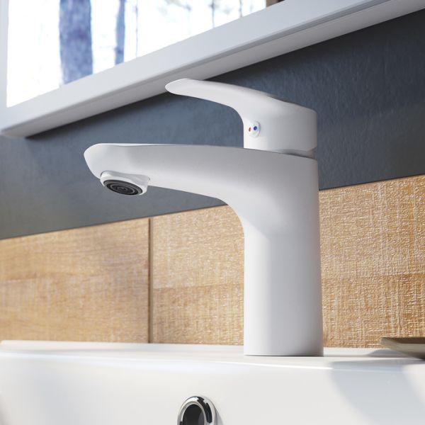 Смеситель для умывальника Ray имеет универсальный дизайн и благодаря трендовому матовому белому цвету станет ярким акцентом современного интерьера ванной. Аэратор в смесителе расположен под наклоном, направляя струю в удобную точку, что делает комфортным и мытье рук, и наполнение больших емкостей.