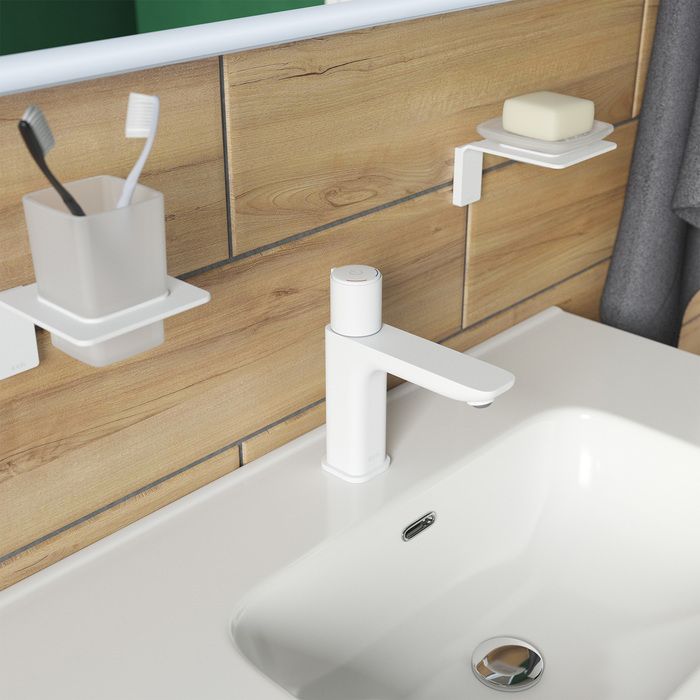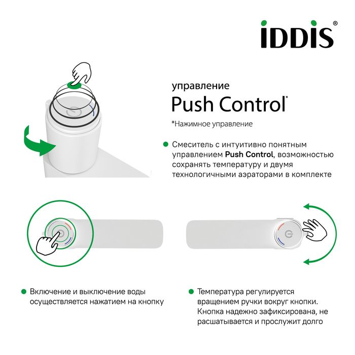 Смеситель для умывальника Slide с управлением Push Control в актуальном белом цвете — новый уровень удобства и стиля IDDIS®. Интуитивно понятное кнопочное управление Push Control — точная и невероятно простая настройка комфортной температуры воды. Включение-выключение воды осуществляется простым нажатием кнопки, а температуру можно регулировать вращением ручки вокруг кнопки. При этом смеситель запоминает комфортную температуру воды: достаточно просто оставить ручку в выбранном положении — и больше не нужно настраивать воду при каждом включении смесителя.