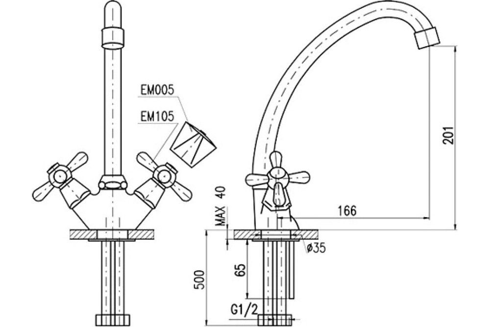 Кухонный смеситель для бойлеров с низким давлением Rav Slezak EM113.5/1, двухвентильный, с аэратором, изготовлен из высококачественной латуни, которая исключает какую-либо коррозию. Металлические рукоятки. Поворотный излив, 360 градусов, длиной 166 мм. Гибкие подсоединительные шланги. Гибкая подводка G1/2, длиной 500 мм. В комплекте смеситель, гибкая подводка и крепления.