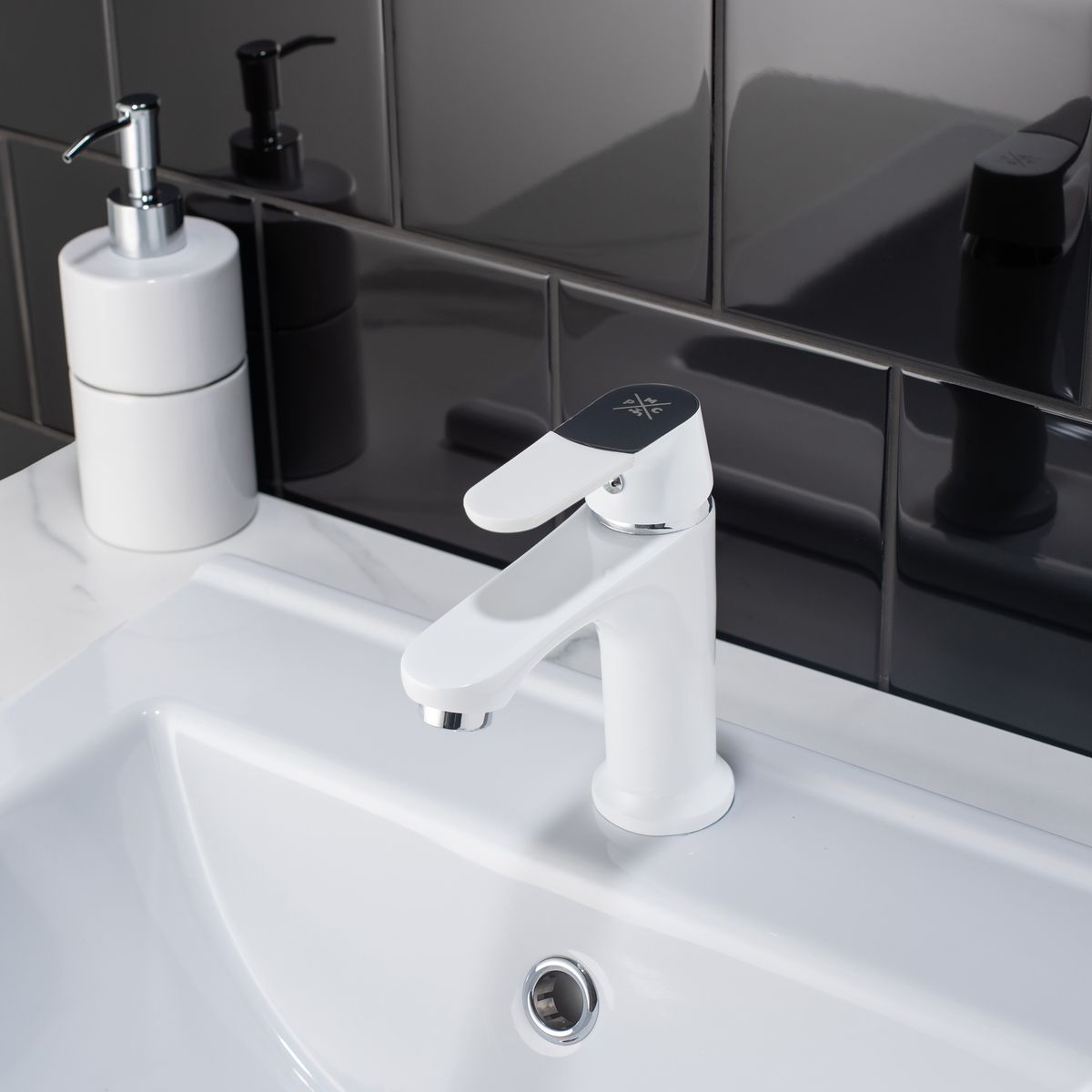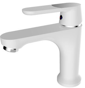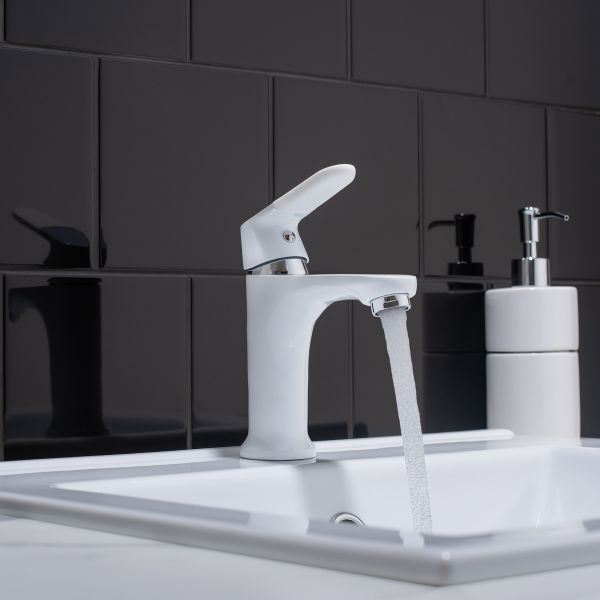 Одноручковый смеситель для умывальника с монолитным коротким изливом выполнен в элегантном белом оттенке и станет стильным элементом интерьера.