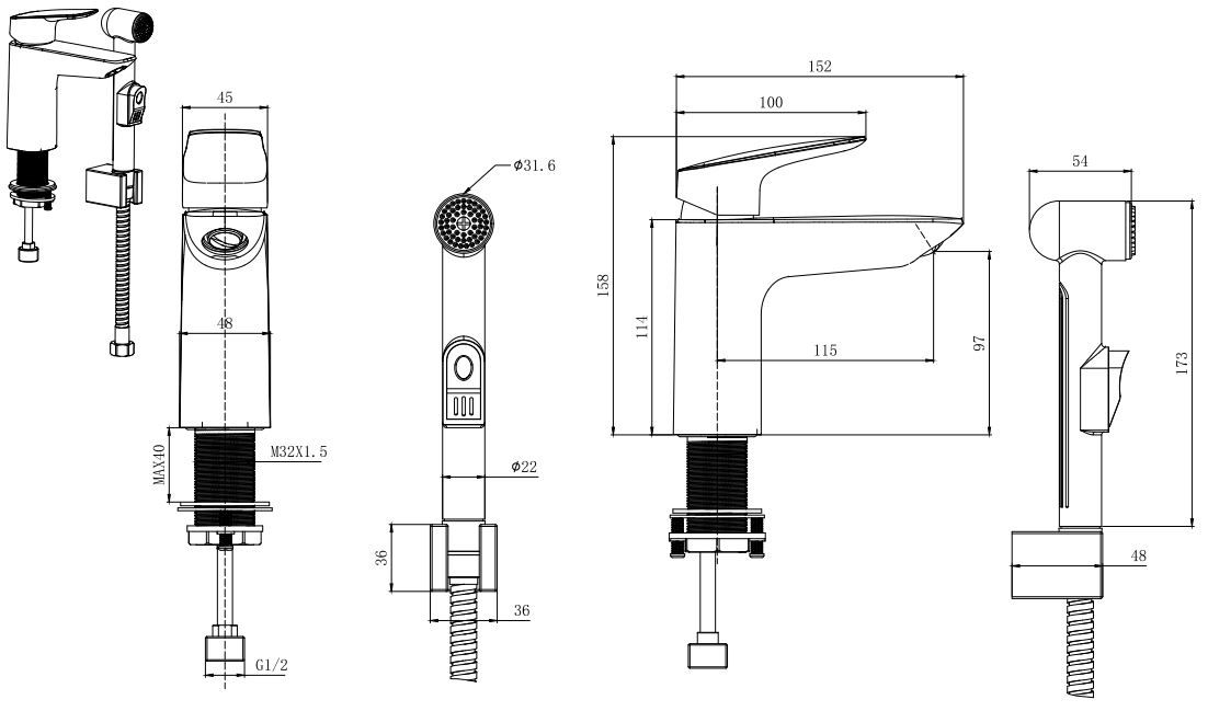 • Гигиеническая лейка, размер лейки 173*54 мм, оснащена нажимным механизмом для остановки потока воды