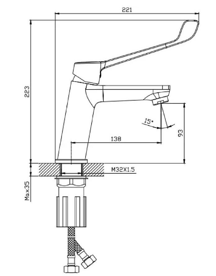 S08.10 Смеситель для раковины с хирургической ручкой локтевой, изготовлен из латуни, керамический картридж 35 мм, хром покрытие. Подводка 50 см, на усиленной гайке. Гарантия 5 лет.