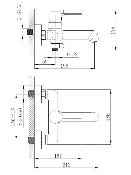 Керамический картридж 35 мм.Диаметр декоративных чашек 60 мм.Душевой гарнитур в комплекте.Межосевое расстояние (расстояние между выходом горячей и холодной трубы) 150 мм.Данное расстояние изменяется за счет входящих в комплект эксцентриков на 15 мм в большую или меньшую стороны.