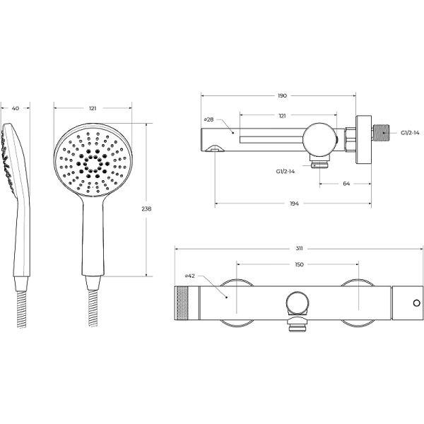- Размер ручного душа: 23,8 х 12,1 х 4 см