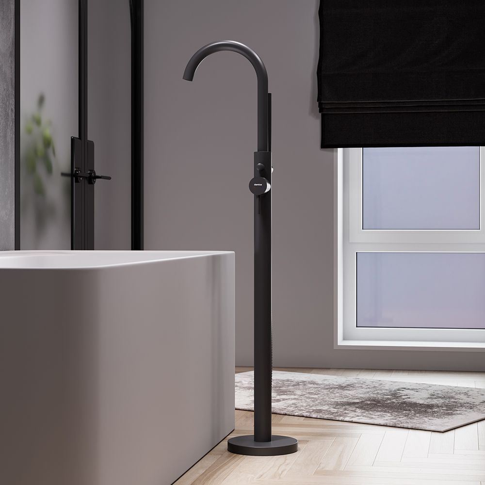 Смеситель для ванны и душа Damixa Scandinavian Pure 365000300 черныйКорпус смесителя 1 шт.; излив 1 шт.; кронштейн крепления 1 шт.; комплект крепежный 1 шт.; ручной душ 1 шт.; шланг 1 шт.; гибкая подводка 2 шт.; декоративная розетка 1 шт.; инструкция изделия. Хром, высокий отдельностоящий смеситель для ванны и душа, ручка Stick