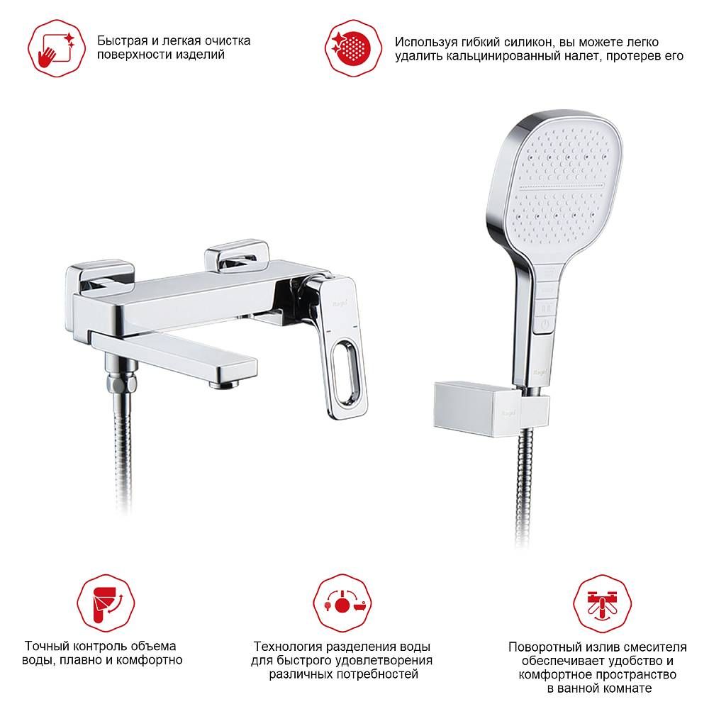 Смеситель для ванны Raglo R51.30 с душевым гарнитуром.Цвет: хром.Материал: латунь.Управление: однорычажное.Механизм: керамический картридж.Излив: поворотный. Аэратор.Количество режимов струи ручного душа: 4.Переключение режимов ручного душа: кнопочное.Стандарт подводки: G 1/2.Отверстия для монтажа: 2.Монтаж: на стену.