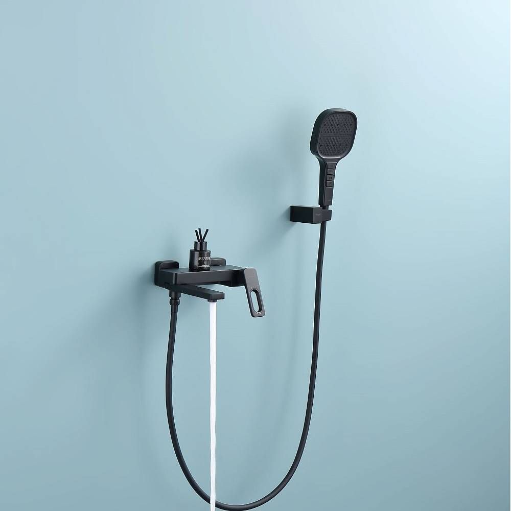 Смеситель для ванны Raglo R51.30.06 с душевым гарнитуром.Цвет: ччерный.Материал: латунь.Управление: однорычажное.Механизм: керамический картридж.Излив: поворотный. Аэратор.Количество режимов струи ручного душа: 4.Переключение режимов ручного душа: кнопочное.Стандарт подводки: G 1/2.Отверстия для монтажа: 2.Монтаж: на стену.